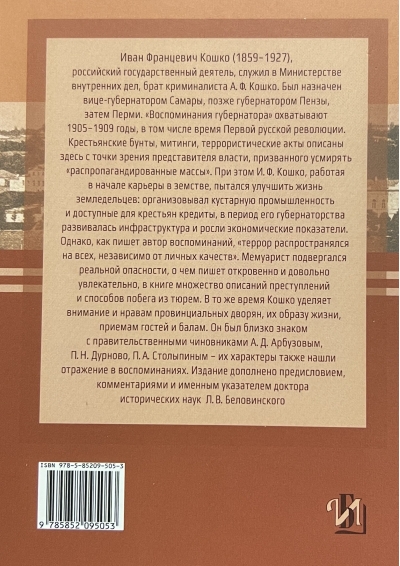 Ivans Francevičs Koško (1859-1927) bija Krievijas valstsvīrs, Iekšlietu ministrijas darbinieks, kriminālista A. F. Koško brālis. Samaras vicegubernators, vēlāk Penzas, pēc tam Permas gubernators. "Atmiņas par gubernatoru" aptver 1905-1909. gadu, tostarp Pirmās krievu revolūcijas laiku. Zemnieku sacelšanās, mītiņi, terora akti šeit aprakstīti no varas pārstāvja, kurš bija aicināts savaldīt "propagandētās masas", viedokļa. Tajā pašā laikā I. F. Koško, karjeras sākumā strādājot zemniecībā, centās uzlabot zemnieku dzīvi: viņš organizēja vasarnīcu un pieejamus aizdevumus zemniekiem, viņa gubernatora darbības laikā attīstījās infrastruktūra un pieauga ekonomiskie rādītāji. Tomēr, kā raksta atmiņu autors, "terors izplatījās uz visiem, neatkarīgi no personiskajām īpašībām". Memuārists bija pakļauts reālām briesmām, par kurām viņš raksta visai aizraujoši, grāmatā ir arī daudz noziegumu un bēgšanas veidu no cietumiem aprakstu. I. F. Koško pievērš uzmanību arī provinces muižnieku manierēm, viņu dzīvesveidam, pieņemšanām un ballēm. Viņš bija cieši pazīstams ar valdības pārstāvjiem A. D. Arbuzovu, P. N. Durnovu, P. A. Stolipinu - viņu raksturi atspoguļoti viņa memuāros.