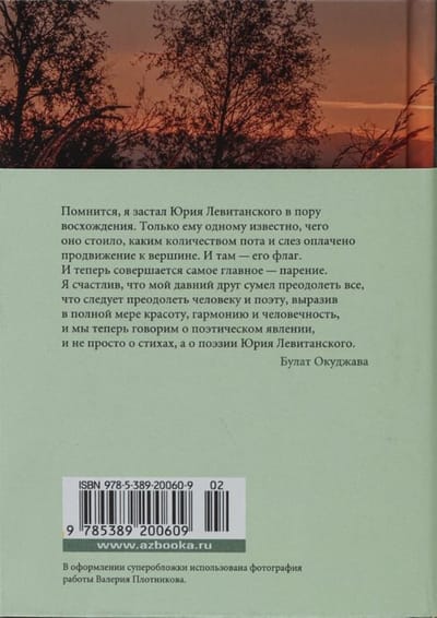 Jurijs Levitānskis, padomju un krievu dzejnieks un tulkotājs, viens no smalkākajiem 20. gadsimta liriķiem, dzimis 1922. gadā Ukrainā. Pēc skolas beigšanas viņš iestājās tolaik slavenajā Maskavas Filozofijas, literatūras un vēstures institūtā IFLI. No otrā kursa brīvprātīgi devās uz fronti, piedalījās Maskavas aizstāvēšanā, no 1943. gada regulāri publicējās frontes avīzēs. Pēckara laikā publicējis vairākus dzejoļu krājumus, nodarbojies ar tulkojumiem. Daudzi Levitaņska dzejoļi - "dvēseles pārdzīvojumu akvareļi" (M. Lukonins) - tika iemūžināti un kļuva par dziesmām, tostarp slavenais "Dialogs pie Jaungada eglītes", kas dzirdams filmā "Maskava asarām netic". Pagrieziena punkts dzejnieka daiļradē bija šajā izdevumā iekļautā dzejoļu grāmata "Kinematogrāfs" (1970), kas atnesa autoram skaļu slavu. Tāpat kā nākamie krājumi "Tā un tā diena" (1976) un "Vēstules Katerīnai jeb Pastaigas ar Faustu" (1981), arī "Kinematogrāfs" tapis kā vienots darbs, kas veidots pēc muzikālās kompozīcijas likumiem. Šis izdevums ir papildināts ar darbiem no grāmatas "Baltie dzejoļi" (1991), kas tapuši mūža pēdējos gados un atzīti par vienu no Jurija Levitaņska daiļrades virsotnēm.