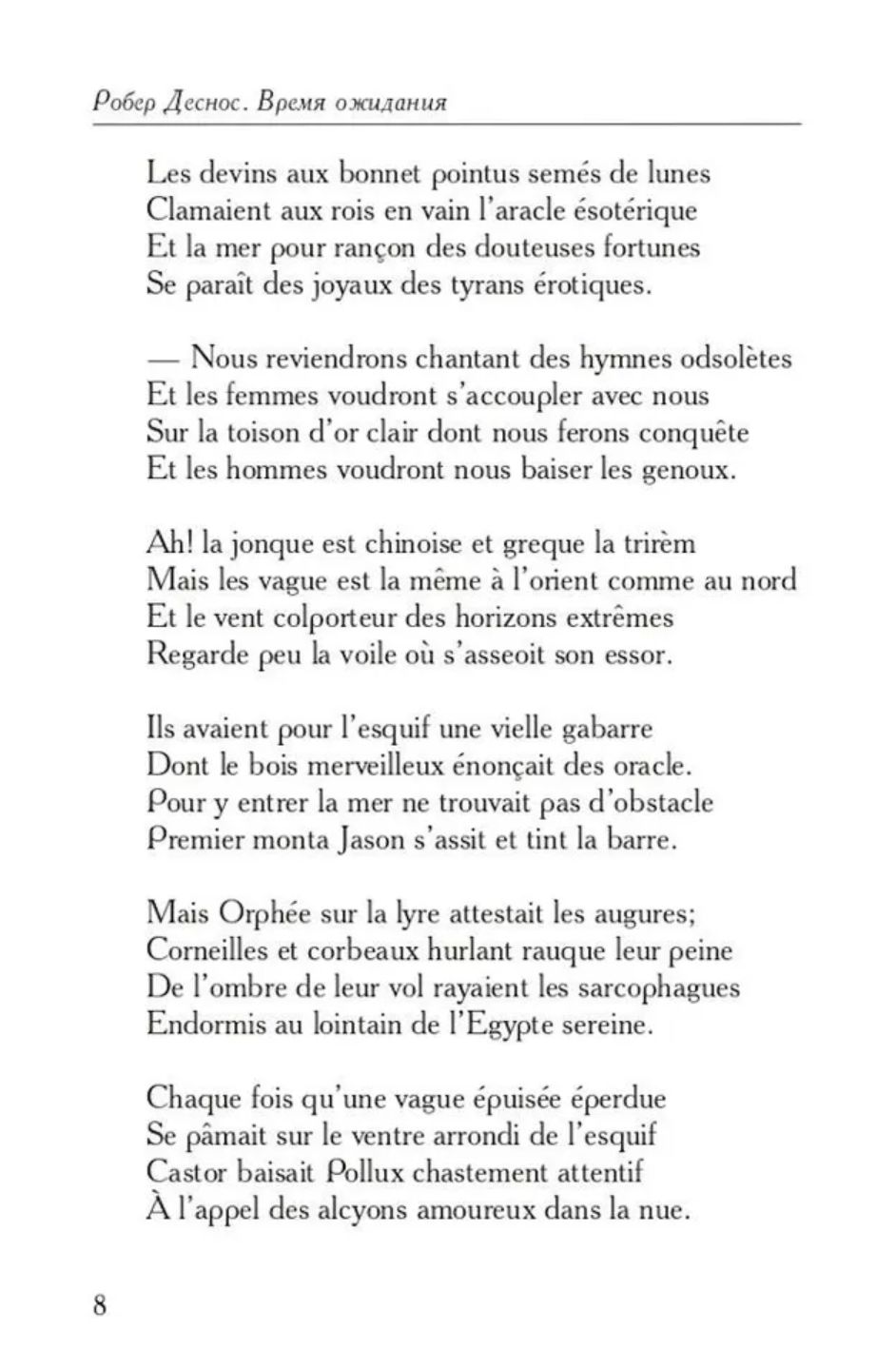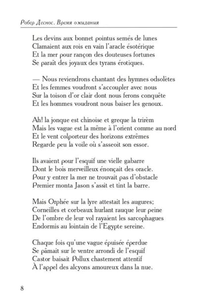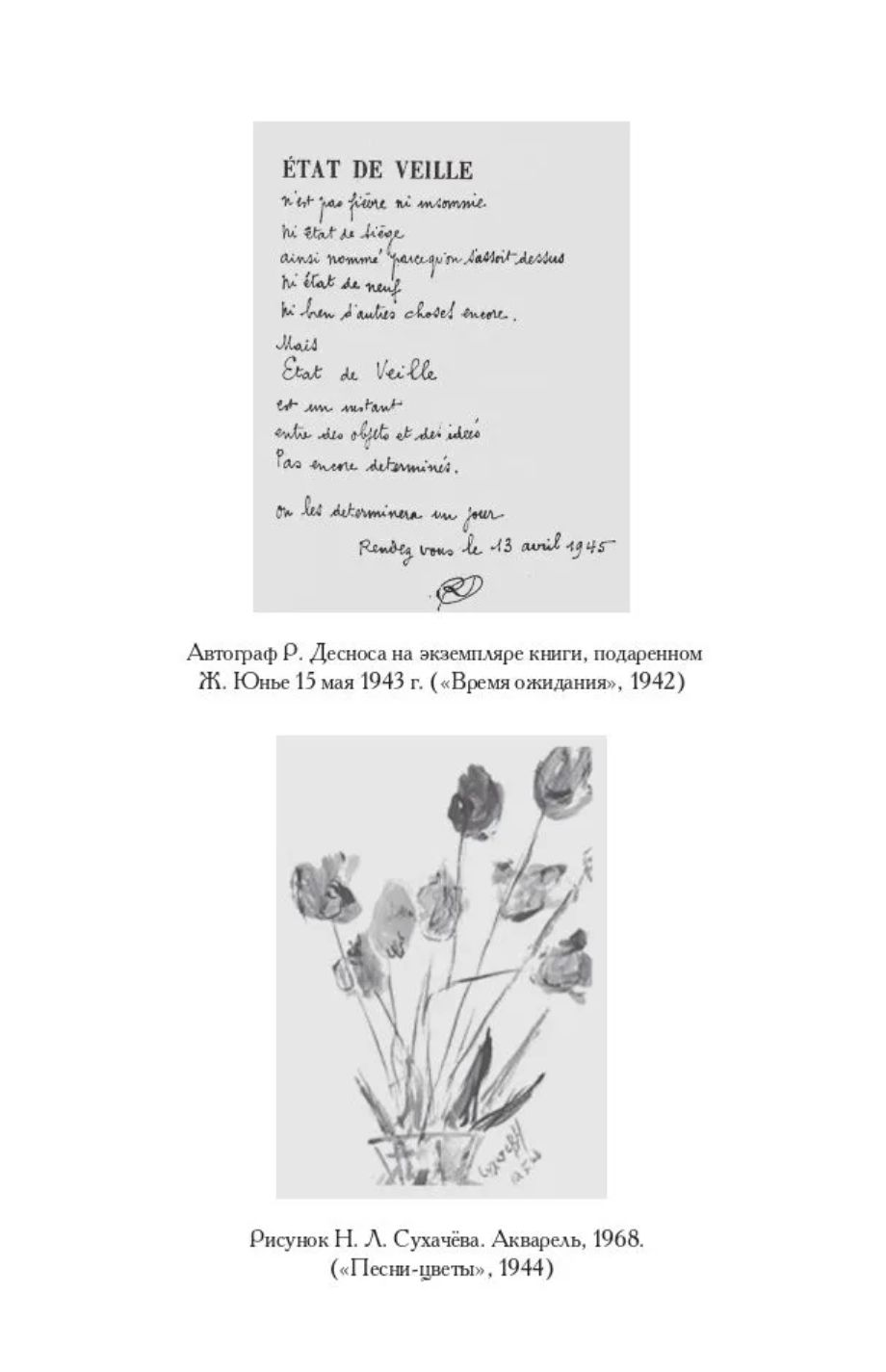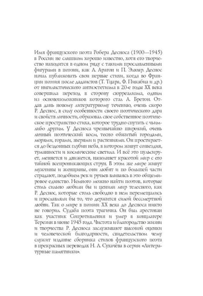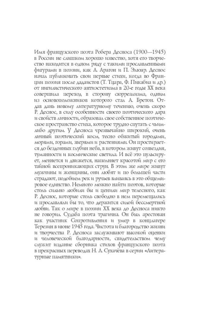 Franču dzejnieka Roberta Desnosa (1900–1945) vārds Krievijā nav labi pazīstams, lai gan viņa daiļrade ierindojas līdzās tādām slavenām dzejas personībām kā Luijs Aragons un Pjērs Eluārs. Desnoss sāka publicēt savus pirmos dzejoļus, kad, sekojot dadaistiem (T. Cara, F. Pikabija un citiem), franču dzeja 20. gadsimta 20. gados pārgāja no dadaistu nihilistiskā antiestētisma uz sirreālismu, kura viens no dibinātājiem bija A. Bretons. Godinot jauno literāro kustību, Desnoss, pateicoties savai poētiskajai dotībai un personībai, drīz vien radīja savu unikālo poētisko telpu, kuru ir grūti sajaukt ar kāda cita telpu. Desnosam ir ārkārtīgi plašs, dziļi personisks poētiskais kosmoss, cieši savīts ar pilsētām, jūrām, kalniem, dzīvniekiem un augiem. Tas sniedzas līdz debesu bezdibenim, kur mīt zvaigznāji, miglāji un kosmiskie ķermeņi. Un tas viss pulsē, mainās un kustas, piepildot pasauli ar skaistumu, ar savu visaptverošo stīgu noslēpumainību. Arī vīrieši un sievietes dzīvo šajā pasaulē, mīlot un lielākoties ciešot, gluži kā upes un strauti, kas ieplūst šajā universālajā vienotībā. Tikai daži dzejnieki ir mīlējuši un lolojuši fizisko pasauli tik ļoti kā R. Desnoss, kurš tajā pārvietojās tik brīvi un svinēja to, ko uztur nemirstīgās mīlestības spēks. Neviens pirms Desnosa 20. gadsimta dzejā nebija runājis par pasauli šādā veidā. Dzejnieka liktenis ir traģisks. Viņš tika arestēts kā Pretošanās kustības dalībnieks un nomira Terezinas koncentrācijas nometnē 1945. gada jūnijā. R. Desnosa dzīves un darba tīrība un cēlsirdība ir pelnījusi augstu uzslavu un pateicību, ko apliecina franču dzejnieka dzejoļu krājuma publicēšana N. L. Suhačova brīnišķīgajā tulkojumā sērijā "Literārie pieminekļi".