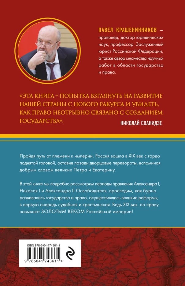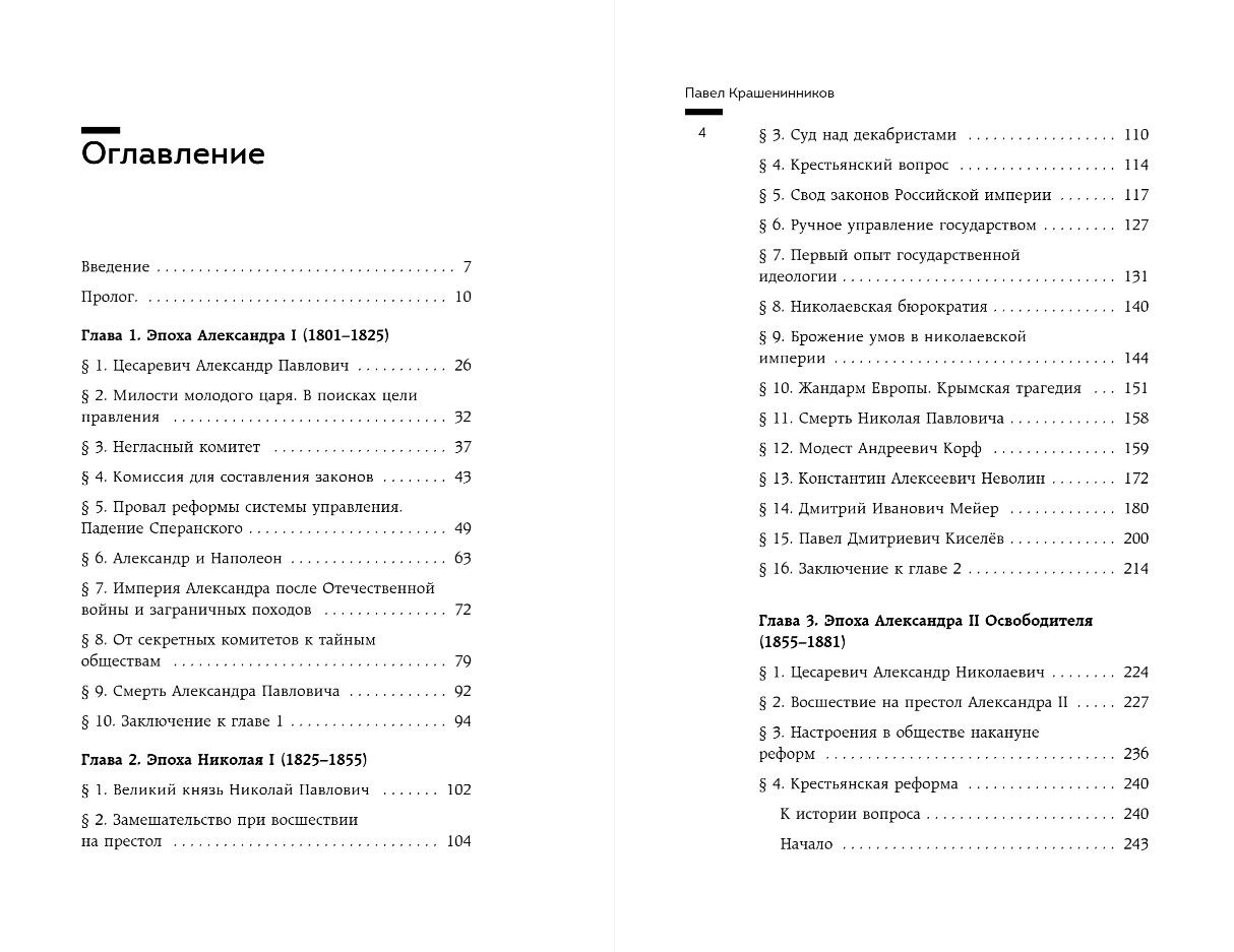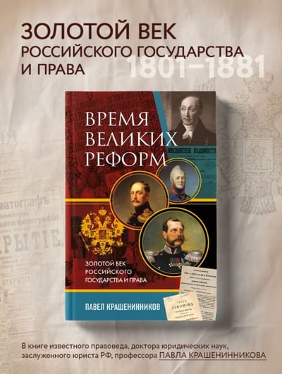 Slavenā krievu tiesību zinātnieka, tiesību zinātņu doktora, profesora Pāvela Krašeniņņikova grāmata “Lielo reformu laiks. Krievijas valsts un tiesību zelta laikmets” aptver laika posmu no imperatora Aleksandra I kāpšanas tronī 1801. gadā līdz imperatora Aleksandra III valdīšanas sākumam 1881. gadā.