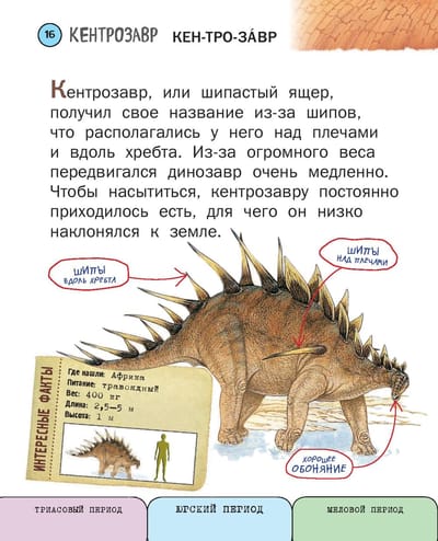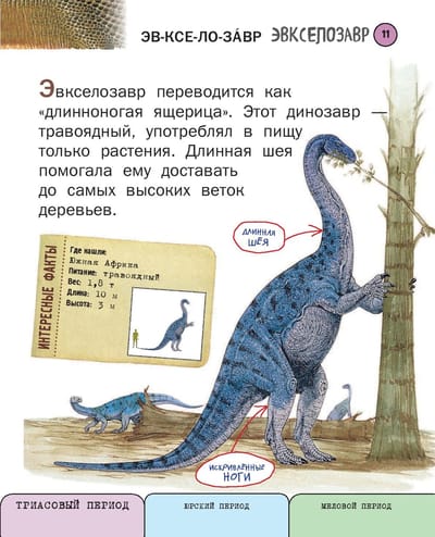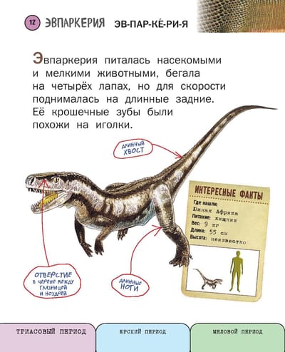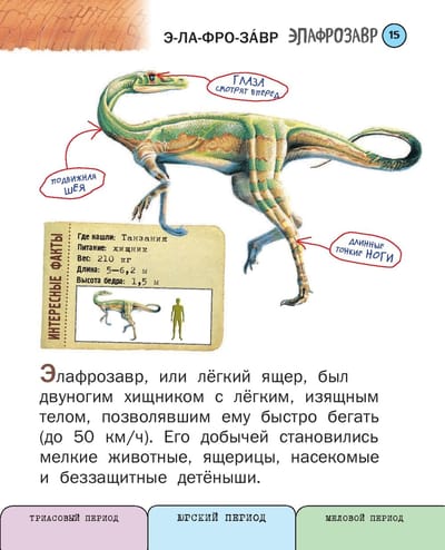 - Papildu plāksnes ar interesantiem faktiem un vizuālu diagrammu, kurā attēlota šī dinozaura un cilvēka izmēru attiecība.