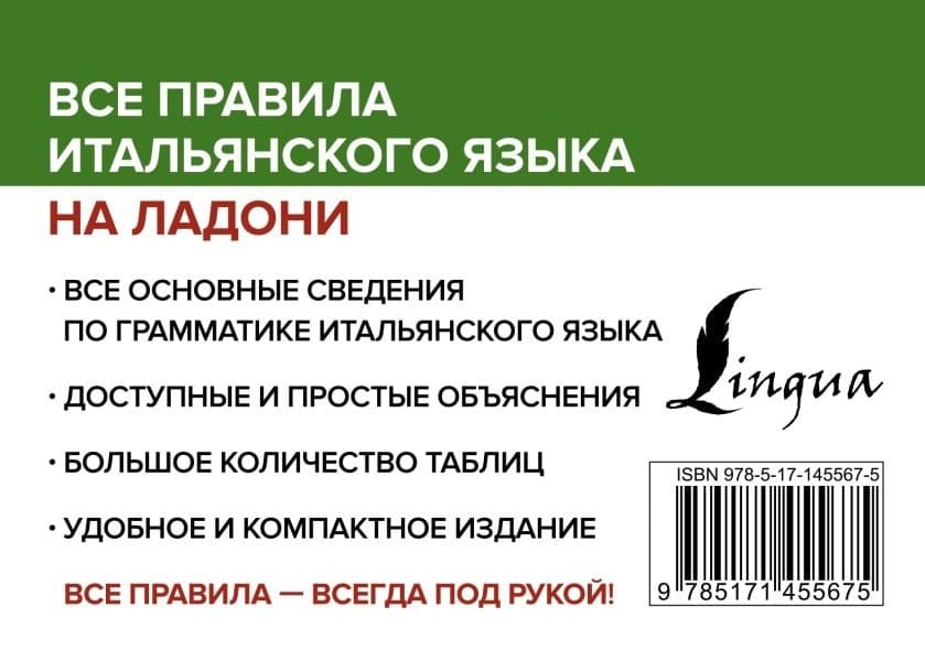 Šis izdevums ir universāls itāļu valodas gramatikas ceļvedis. Ērtais formāts (kompakta grāmata spirālveidā) ļauj šo rokasgrāmatu vienmēr turēt pa rokai. Šajā rokasgrāmatā ir iekļauti visi itāļu valodas gramatikas pamatnoteikumi. Materiāls ir izklāstīts tabulu veidā, kas ievērojami atvieglo tā uztveri. Teorētiskajā daļā ir sniegti lietošanas piemēri ar tulkojumu krievu valodā. Rokasgrāmata paredzēta visiem, kas apgūst itāļu valodu.