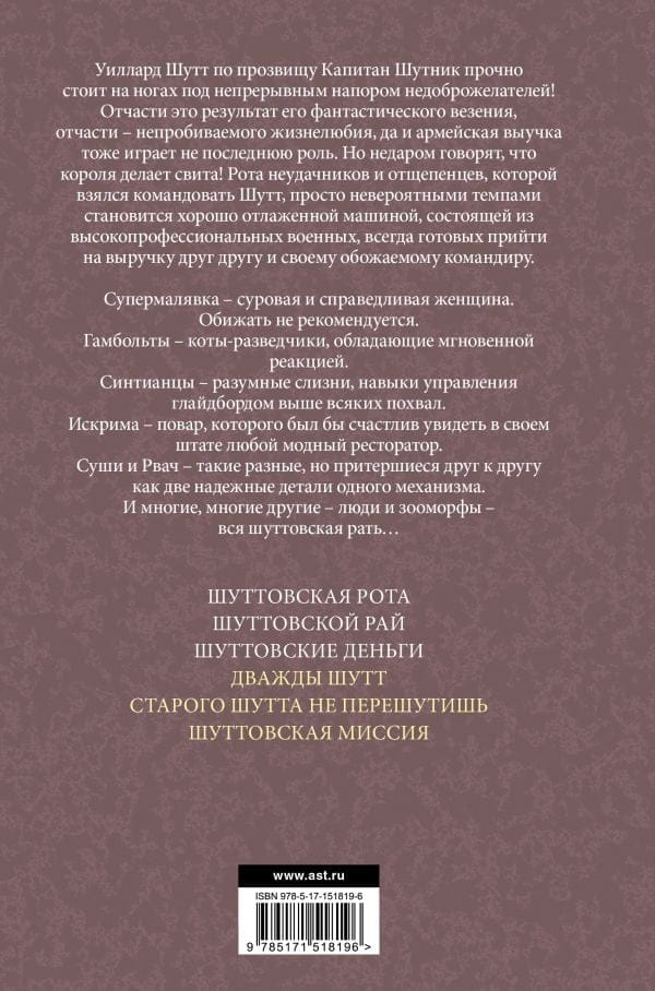 Viljards Šuts, iesaukts par kapteini Džokeru, stingri stāv uz kājām, spītējot nemitīgam savu nelabvēļu uzbrukumam! Daļēji tas ir viņa fantastiskās veiksmes, daļēji viņa neatslābstošās vitalitātes un daļēji armijas apmācības rezultāts. Taču ne velti mēdz teikt, ka karali dara svīta! Nejaušnieku un šķeltņu rota, kuras vadību ir uzņēmies Šūts, kļūst par labi ieeļļotu mašīnu, ko veido augsti profesionāli militāristi, vienmēr gatavi palīdzēt cits citam un savam dievinātajam komandierim. Supermaliavka ir skarba un taisnīga sieviete. Viņu aizvainot nav ieteicams. Humbolti - izlūku kaķi ar tūlītēju reakciju. Sintiji - inteliģenti slinkotāji, kuru spīdveja vadības prasmes ir pārākas par pārmetumiem. Iskrima ir pavārs, kuru savā personālā labprāt uzņemtu jebkurš izsmalcināts restorāns. Suši un Rvahs - tik atšķirīgi, bet trina viens otru kā divas uzticamas vienas mašīnas detaļas. Un daudzi, daudzi citi - cilvēki un zoomorfi - visa Jestera banda...