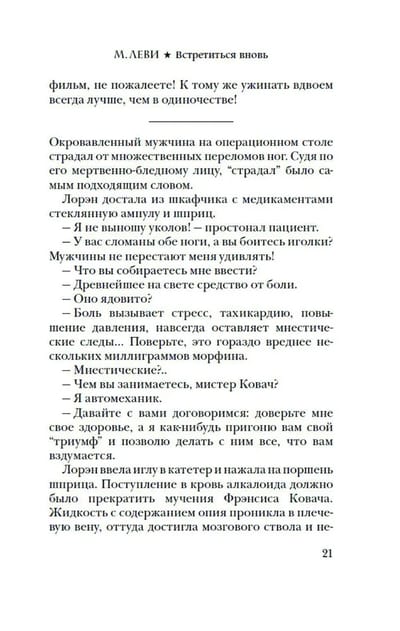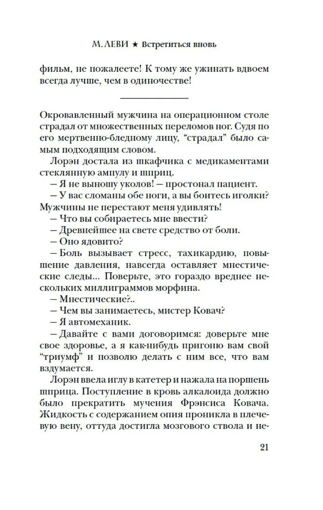 Kādreiz Artūra mīlestība atgriež Lorēnu atpakaļ dzīvē; tāpat kā agrāk viņa strādā par neiroķirurģi Sanfrancisko memoriālajā slimnīcā, taču pēc vairāku mēnešu komas diemžēl viņa neatceras savu pagātni. Tomēr Artūrs nekad nav aizmirsis viņu, savu sapņu sievieti, un liktenis viņus atkal saved kopā, lai gan pārāk stāvā līkumā. Viņa viņu nepazīst, taču jūt neizskaidrojamu pievilkšanu ... Viena no populārākajiem franču rakstnieku Marca Levī romāns "Atkal satiekamies" atgriež mūs pie plašā lasītāju lokā iemīļotā un Holivudā veiksmīgi ekranizētā romāna "Starp debesīm un zemi" varoņiem un izgaismo viņu turpmākos likteņus. Romantisks stāsts, pilns piedzīvojumu, negaidītu sižeta pavērsienu, prieka un bēdu, riska un īstu jūtu.