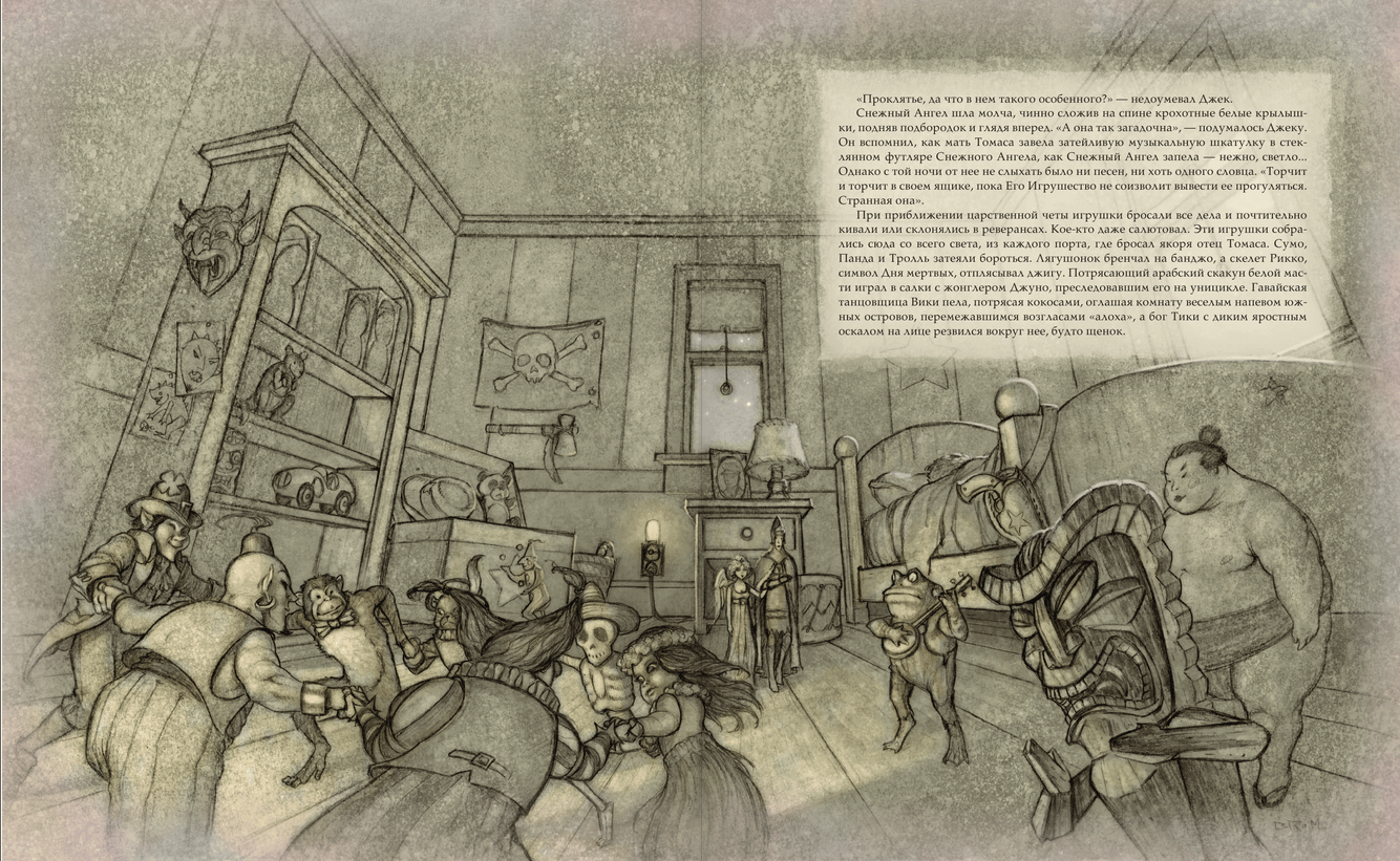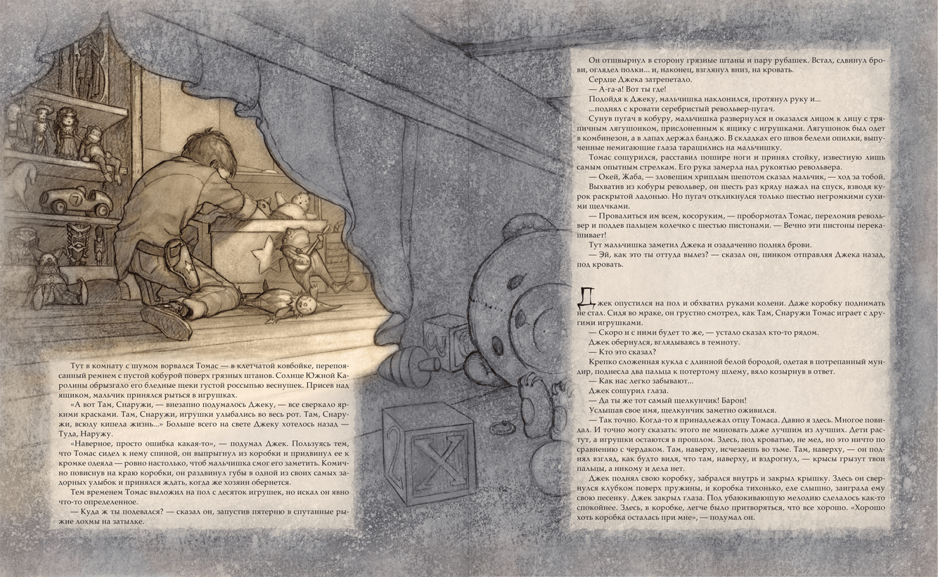 Iztēles spoku sfērā Džeks, izsviests no kastes zem gultas, putekļainā tumsā, zirnekļiem un citām aizmirstām rotaļlietām, ir spiests pieņemt rūgto patiesību: bērni aug, un rotaļlietas paliek pagātnē. Džeks ir pārliecināts, ka tas ir sliktākais, kas var notikt ar rotaļlietu. Bet, kad Džekam tiek uzticēta apšaubāma aizstāvja Tomasa loma, tas pats zēns, kurš viņu pagrūda zem gultas, Džeks atklāj, ka rotaļlieta spēj saprast sliktāko – daudz sliktāku likteni. Šķiet, ka situācija ir izmisusi, bet kādā grūtā brīdī, lai palīdzētu Džekam nākt uz citām Tomasa rotaļlietām – Pērtiķi, Nutkrakeri un nedabiski skaistu porcelāna lelli Sniega eņģeli. Lai glābtu savu mīļoto zēnu, rotaļlietām ir grūti pacelties pāri savām vienkāršajām marionešu lomām. Apvienojot stāstītāja talantu ar unikālām burvīgām ilustrācijām, pasaulslavenais rakstnieks un mākslinieks Broms, strādājot tumšās fantāzijas žanrā, radīja ilustrētu romānu, satriecošu iztēli - pasauli, kurā pasaku tradīcijas tiek apvienotas ar ļaunumu un negantību, ar mīlestību un varonību, ar ciešanām un pašaizliedzību.