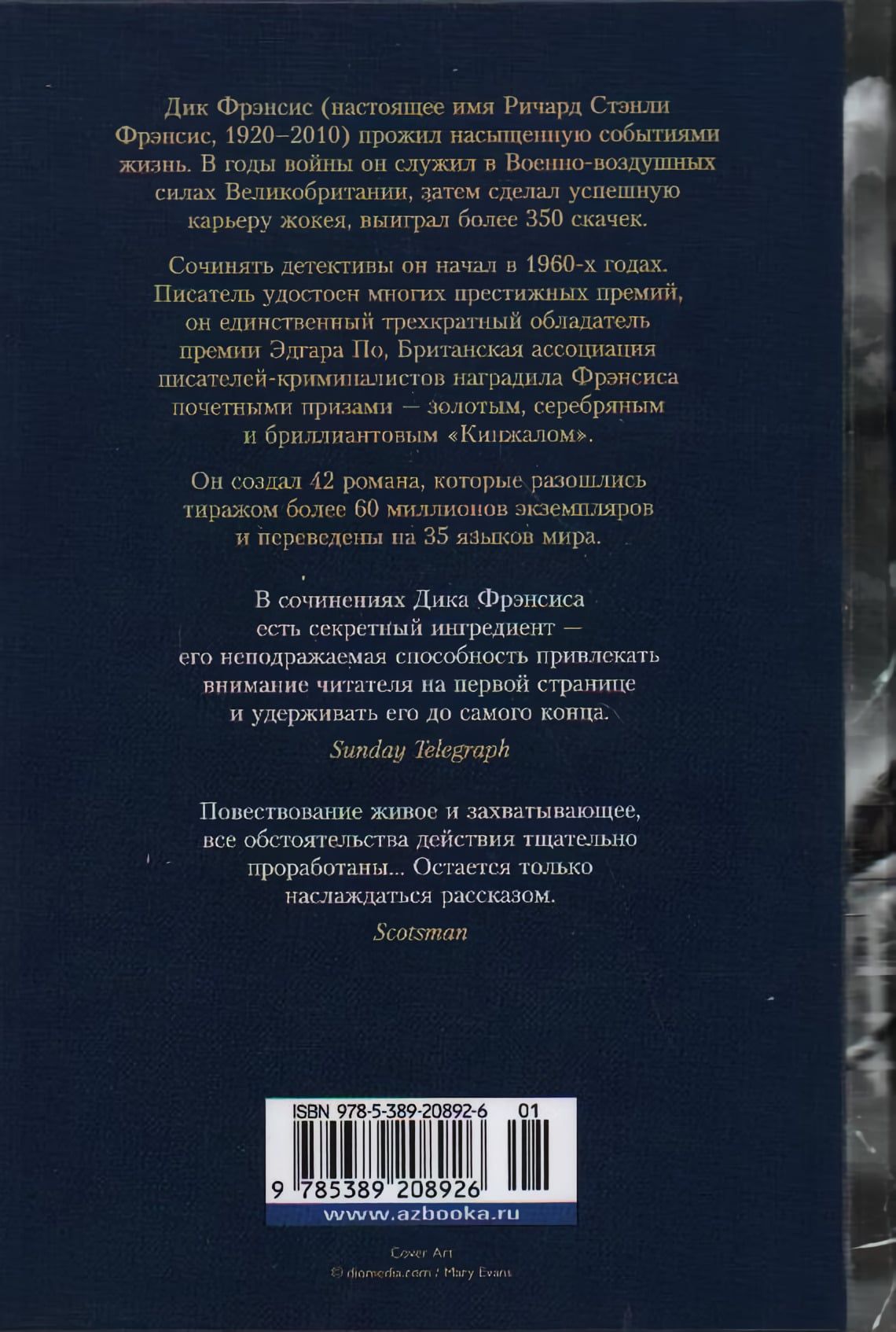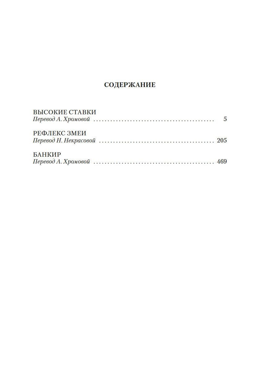 Diks Frānsiss (Dick Francis, 1920-2010) bija viens no slavenākajiem Anglijas detektīvu autoriem. Savas dzīves laikā viņš sarakstīja vairāk nekā 30 starptautiski atzītus bestsellerus. Viņa romāni galvenokārt veltīti zirgu skriešanās sacīkšu pasaulei - Frānsiss to pārzināja no pirmavota, jo bija dzimis žokejistu ģimenē un pats bija slavens žokejs. Šī pasaule ir aizraujoša, ap krāšņajiem zirgiem un lielajām likmēm totalizatoros virmo neviltotas kaislības, ir ko ēst krāpniekiem. Tas viss un kalpojis par materiālu aizraujošiem romāniem, kas kļuvuši par bestselleriem daudzās pasaules valstīs. Krājumā iekļauti romāni "Augstas likmes" (1975), "Čūskas reflekss" (1980) un "Baņķieris" (1982).