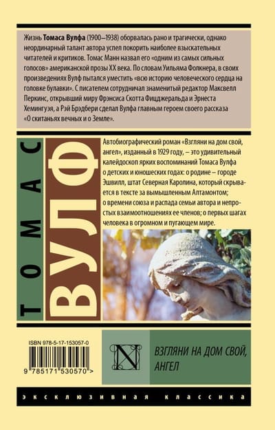1929. gadā izdotais autobiogrāfiskais romāns "Paskaties savā mājā, eņģelīt," ir brīnišķīgs kaleidoskops, kurā Tomasa Volfa spilgtās atmiņas par bērnību un pusaudža gadiem: par dzimto pilsētu Ešvilu Ziemeļkarolīnā, kas tekstā slēpjas aiz izdomātā Altamonta, par autora ģimenes savienības un izjukšanas laiku un tās locekļu neērtajām attiecībām, par cilvēka pirmajiem soļiem plašajā un biedējošā pasaulē.