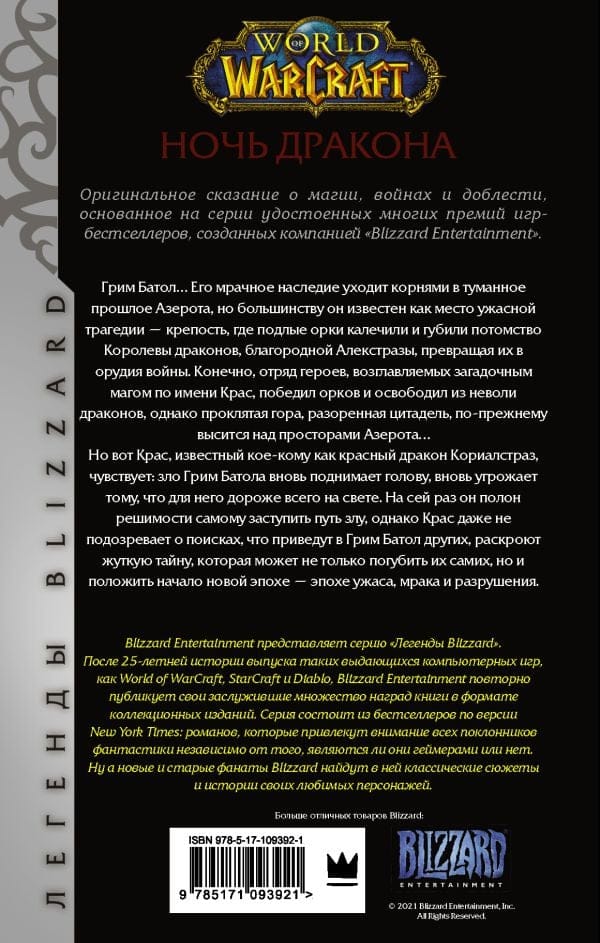 Oriģināls stāsts par maģiju, karadarbību un varonību, kas balstīts uz Blizzard Entertainment radīto daudzkārt apbalvoto bestselleru sēriju. Grim Batol ... Tās drūmais mantojums sakņojas Azerota drūmajā pagātnē, taču lielākajai daļai tā ir pazīstama kā vieta, kur notikusi briesmīga traģēdija - cietoksnis, kurā zemiskie orki sakropļoja un izpostīja pūķu karalienes, dižciltīgās Alekstrazas, pēcnācējus, pārvēršot tos par kara rīkiem. Protams, varoņu grupa noslēpumainā maga vārdā Krass vadībā orkus sakāva un pūķus atbrīvoja no gūsta, bet nolādētais kalns, sagrautā citadele, joprojām slejas virs plašumiem..... Taču Krass, ko daži dēvē par sarkano pūķi Korialstrazu, jūt, ka ļaunais Batolas Grims atkal ceļas un apdraud to, kas viņam ir visdārgākais. Šoreiz viņš ir apņēmības pilns pats stāties ļaunumam ceļā, taču Krass pat nenojauš, kāds meklējums aizvedīs citus uz Grim Batolu, atklājot briesmīgu noslēpumu, kas var ne tikai iznīcināt viņus, bet arī ievadīt jaunu šausmu, tumsas un iznīcības ēru.