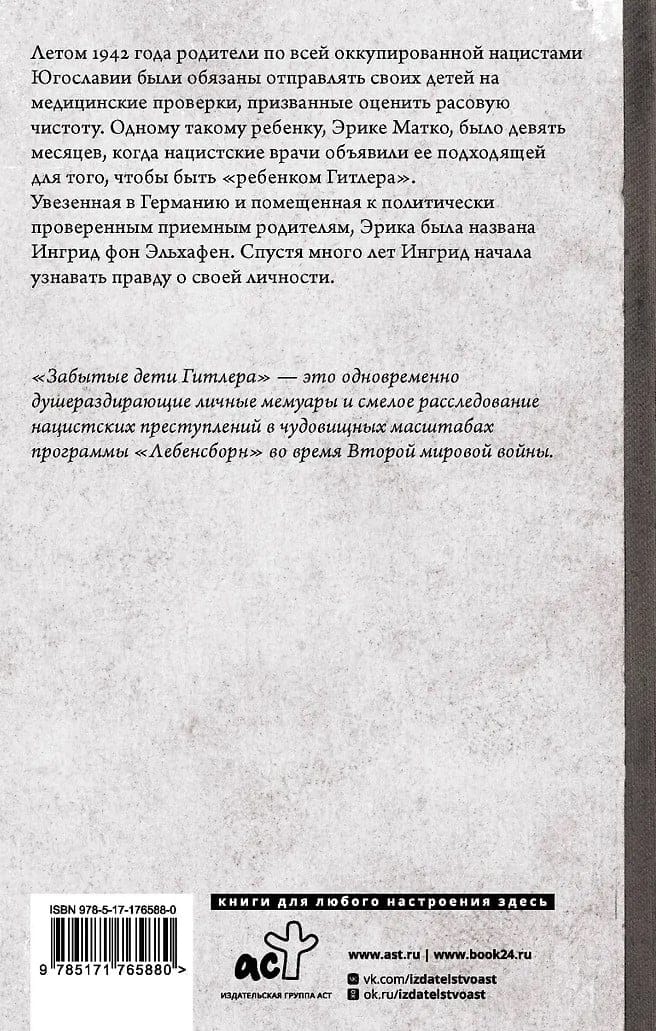 "Hitlera aizmirstie bērni" ir gan sirdi plosošas personiskas atmiņas, gan drosmīga nacistu noziegumu izmeklēšana Lebensbornas programmas milzīgajā mērogā Otrā pasaules kara laikā.