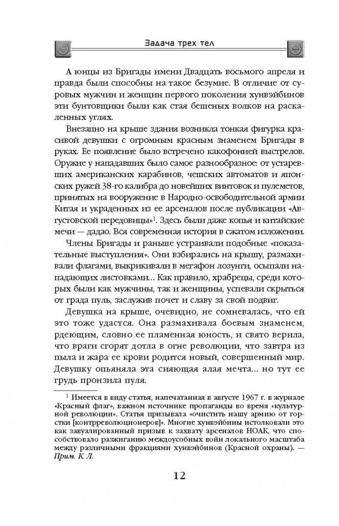 Laikā, kad Ķīna pārdzīvoja vardarbīgās "kultūras revolūcijas" sekas, slepens militārs projekts nosūtīja signālus kosmosā, lai sazinātos ar svešzemju izlūkdienestu. Vienu no signāliem uztvēra civilizācija, kas atradās uz iznīcības sliekšņa, un tagad citplanētieši gatavojas iebrukt uz Zemes. Uzzinājuši par to, cilvēki dalās tajos, kuri ir gatavi nodot mūsu nepilnīgo pasauli augstāka intelekta kontrolē, un tajos, kuri līdz pēdējam cīnīsies pret šo iebrukumu. Ķīnas populārākās rakstnieces Liu Cixin spožais zinātniskās fantastikas romāns "Trīs ķermeņu problēma" ir guvis plašu starptautisku atzinību un kļuvis par pirmo tulkoto grāmatu, kas nominēta prestižākajām zinātniskās fantastikas literatūras balvām: Hugo, Nebula, Locus, Prometheus un citām.