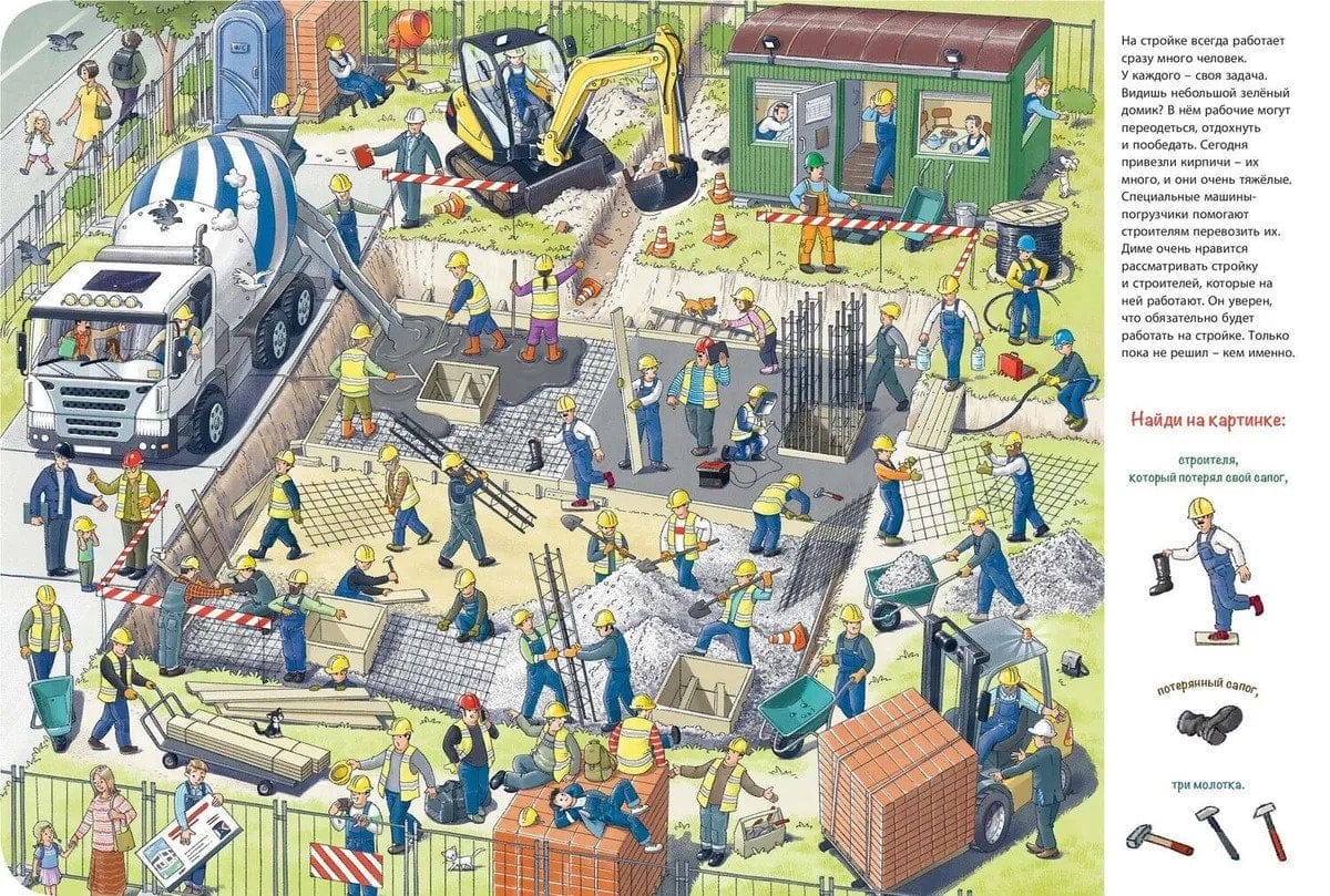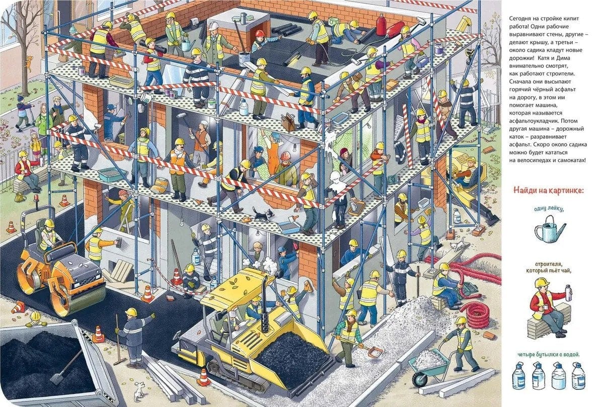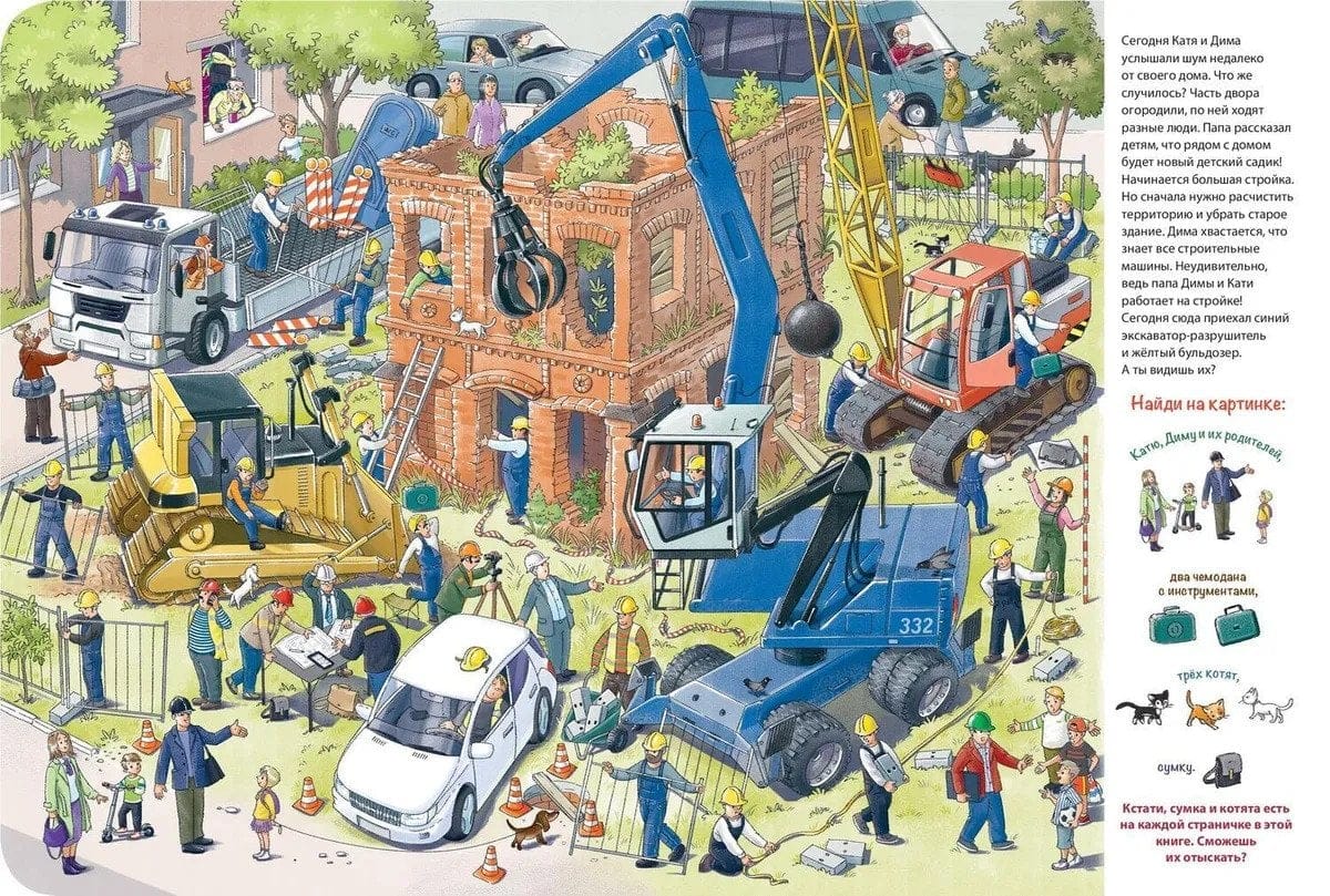 Blakus Katjas un Dimas mājai tiek celta jauna māja - tajā būs bērnudārzs! Vai mēs kopā ar bērniem dosimies uz būvlaukumu? Mēs redzēsim, kā norit celtniecība, un redzēsim, cik daudz interesantu lietu tur notiek. Būvlaukumā vienmēr notiek daudz darba. Tur ir daudz strādnieku. Un cik daudz ir dažādu mašīnu, darbarīku un visdažādāko iekārtu! Uzmanīgi aplūko grāmatu un atrodi katru no tiem.