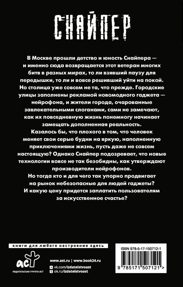 Maskava ir vieta, kur Snaiperis pavadīja savu bērnību un jaunību, un tieši šeit šis daudzu kauju veterāns dažādās pasaulēs atgriežas, vai nu paņēmis atelpas brīdi, vai arī nolēmis doties pensijā. Taču galvaspilsēta vairs nav tāda, kāda tā bija agrāk. Pilsētas ielas piepildītas ar jaunatklātā sīkrīka - neirofona - reklāmām, un pilsētnieki, aizrāvušies ar pievilcīgajiem saukļiem, nepamana, kā viņu ikdienu pamazām sāk aizstāt papildinātā realitāte. Šķiet, kas gan slikts, ja cilvēks nomaina savu pelēko ikdienu pret spilgtu, piedzīvojumu pilnu dzīvi, pat ja tā nav gluži īsta? Tomēr Snaiperim ir aizdomas, ka jaunās tehnoloģijas nav tik nekaitīgas, kā apgalvo neirofona ražotāji. Bet kurš tad un ar kādu mērķi tik neatlaidīgi popularizē gadžetus, kas cilvēkiem nav droši? Un kādu cenu lietotājiem nāksies maksāt par mākslīgo laimi?
