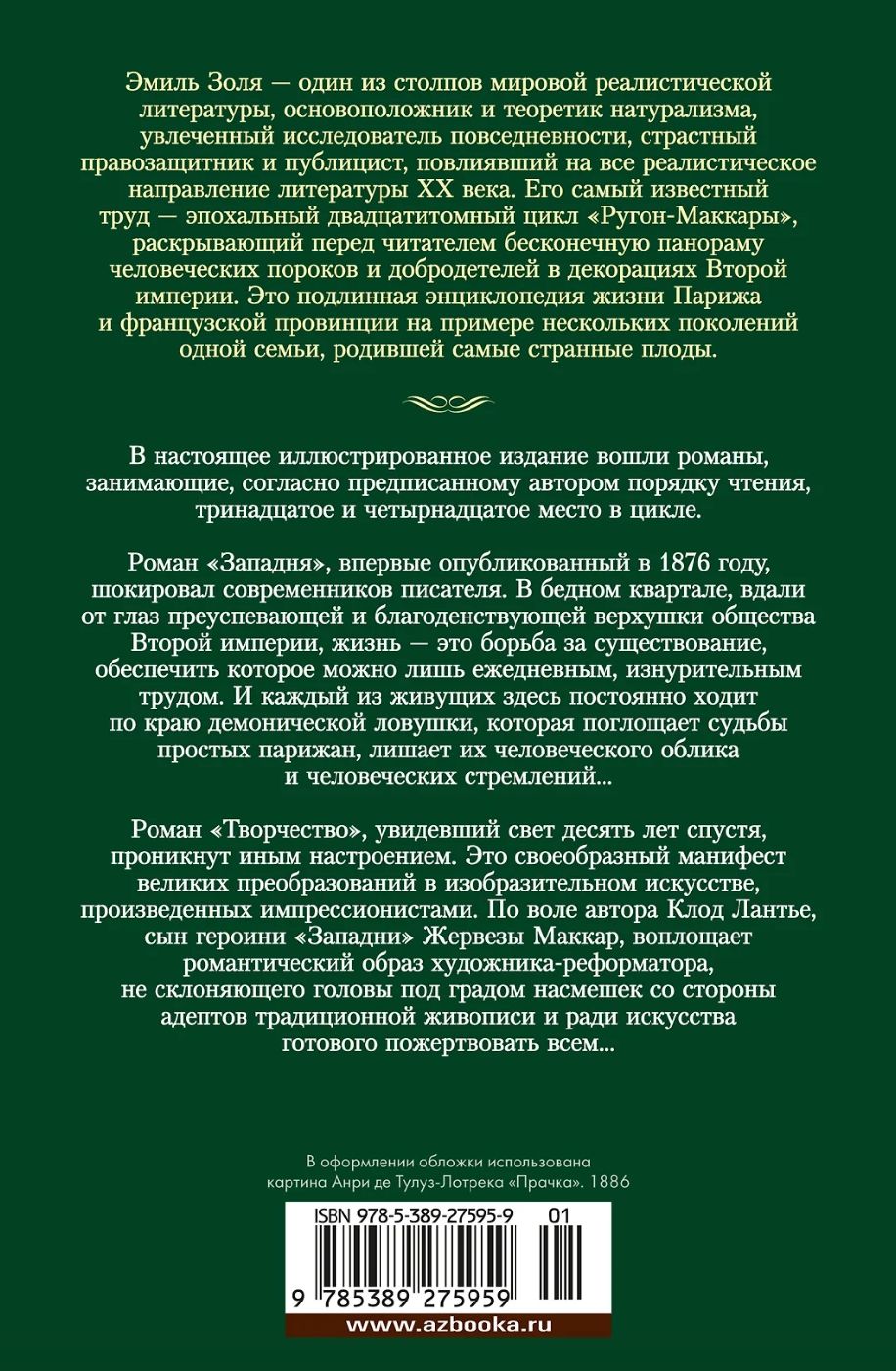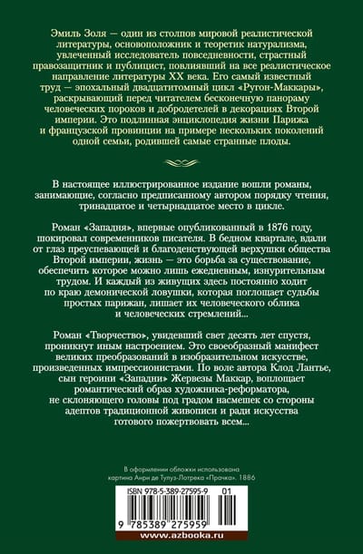 Emīls Zola ir viens no pasaules reālistiskās literatūras pīlāriem, naturālisma pamatlicējs un teorētiķis, dedzīgs ikdienas pētnieks, kaislīgs cilvēktiesību aktīvists un publicists, kurš ietekmējis visu 20. gadsimta literatūras reālistisko virzienu. Viņa slavenākais darbs ir epohālais divdesmit sējumu cikls “Rugons-Macquart”, kas lasītājam atklāj bezgalīgu cilvēku netikumu un tikumu panorāmu Otrās impērijas ainavās. Šī ir patiesa enciklopēdija par dzīvi Parīzē un Francijas provincēs, izmantojot vienas ģimenes vairāku paaudžu piemēru, kas dzemdēja dīvainākos augļus.