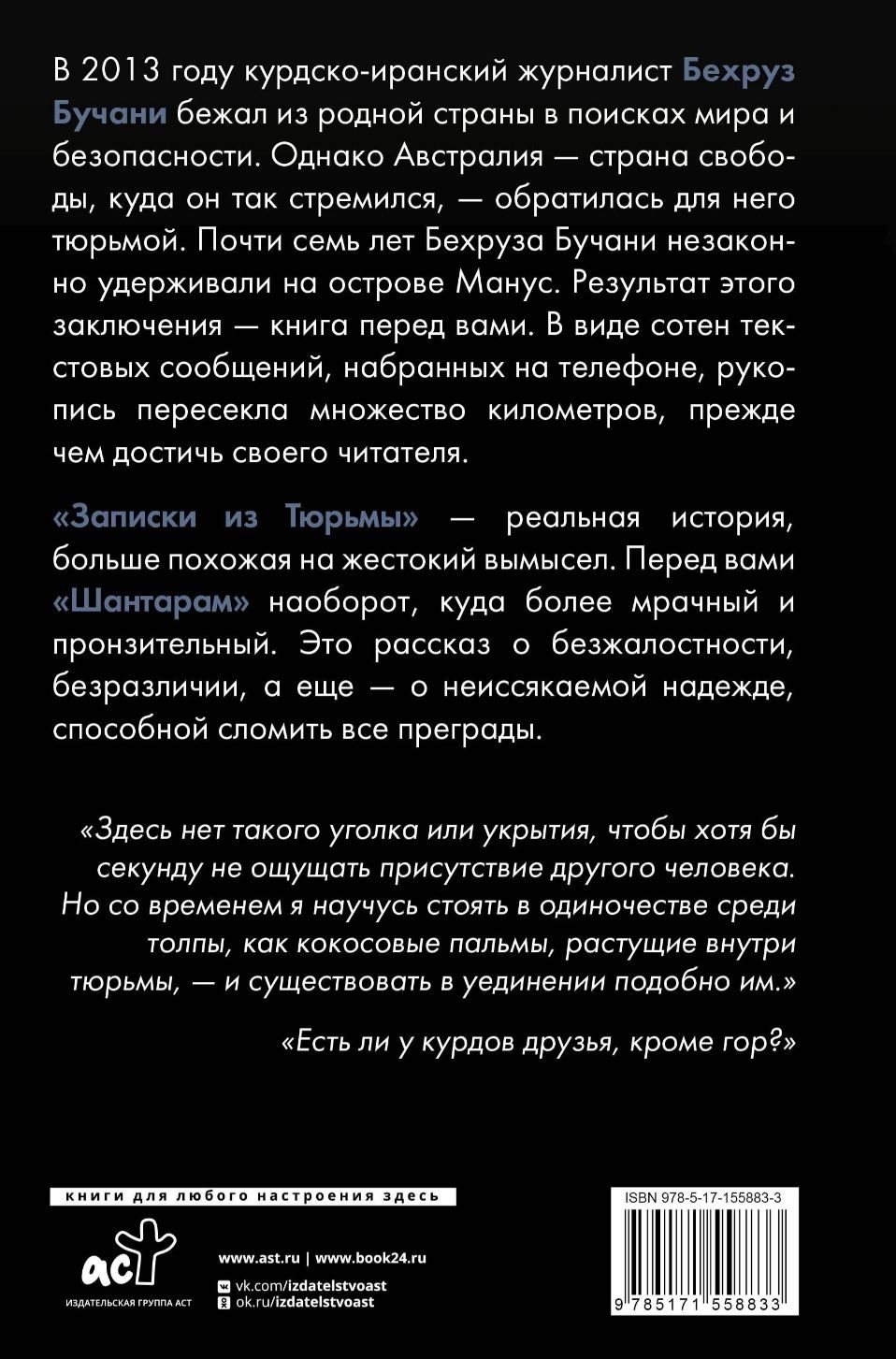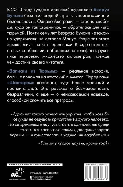 2013. gadā kurdu-irāņu žurnālists Behrouzs Bučani aizbēga no savas dzimtenes, meklējot mieru un drošību. Bet Austrālija, brīvības zeme, pēc kuras viņš bija ilgojies, viņam pārvērtās par cietumu. Behrouzs Bučani gandrīz septiņus gadus tika nelikumīgi turēts tur Manusas salā. Šī secinājuma rezultāts ir grāmata jūsu priekšā. Simtiem īsziņu veidā, kas rakstītas pa tālruni, manuskripts ceļoja daudzus kilometrus, pirms sasniedza savu lasītāju.