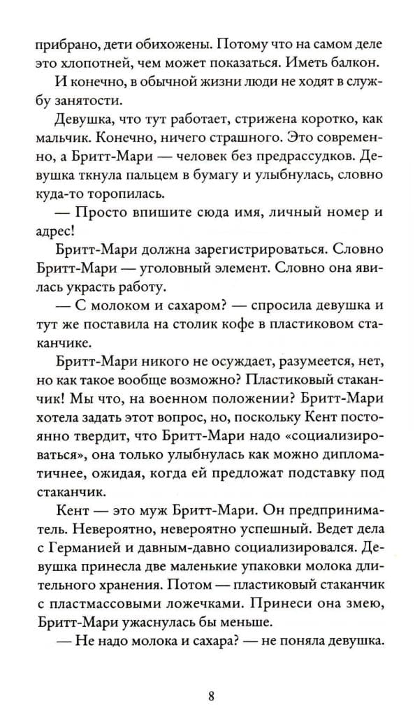 Taču visa šī kārtība sabrūk acumirklī, kad Brita Marija atklāj, ka Kents, ar kuru viņa ir dzīvojusi perfektā laulībā četrdesmit gadus, ir viņu krāpis. Viņa pieņem pārsteidzošu lēmumu: sakravā somas un dodas prom. Attālā provinces pilsētā ar ne pārāk draudzīgu iedzīvotāju skaitu Britai Marijai būs jāveido jauna dzīve. Tāda, kas pilnībā atšķirsies no viņas iepriekšējās.