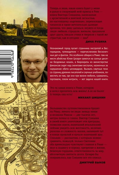 Viktors Sonkins ir filologs, Rietumeiropas un slāvu literatūras speciālists, žurnālists, sinhronais tulks un skolotājs. Viņš ir arī viens no Borisenko-Sonkina semināra (Maskavas Valsts universitāte) direktoriem, kura dalībnieki veidoja detektīvstāstu antoloģijas "Ne tikai Holmss" un "Tikai ne sulainis". Šī grāmata radās autora divu galveno kaislību — klasicisma un ceļošanas — krustpunktā. To var lasīt kā ceļvedi vai kā stāstu par vienu no svarīgākajām vietām uz zemes. Autors centās sekot apgaismotu diletantu, kas iemīlējušies Mūžīgajā pilsētā — Gētes, Bairona, Gogoļa, Dikensa, Marka Tvena, Pāvela Muratova un Pjotra Veila — pēdās. Visvareno pāvestu galvaspilsēta, renesanses un baroka pērle, Mikelandželo un Bernīni pilsēta mirdzēs gandrīz katrā lappusē, taču grāmatas "Roma bija šeit" galvenais saturs ir stāsts par seniem laikiem, par Romula, Cēzara un Nerona pilsētu.