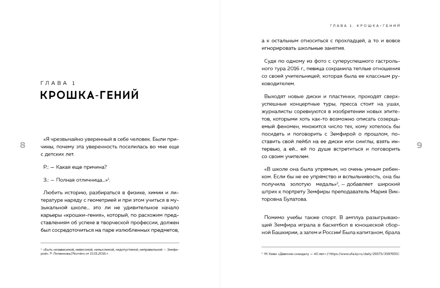 „Vairāk nekā desmit gadus neviens par viņas darbiem neko nav rakstījis, izņemot rakstus. Es nezinu, kā tas ir iespējams. Mēs dzīvojam vienlaikus, viņa ir mūsu tautiete, autore un izpildītāja labāka, dziļāka un talantīgāka, es nezinu par moderno krievu mūziku, saka Olga Žarkova, profesionāla pētniece un vēl profesionālāka Zemfiras fane. Viņas grāmata ir patiess mēģinājums saprast ne tikai darbu, bet arī Zemfiras personību, skatīties uz viņu no dažādiem skatiem un atklāt viņas noslēpumu.