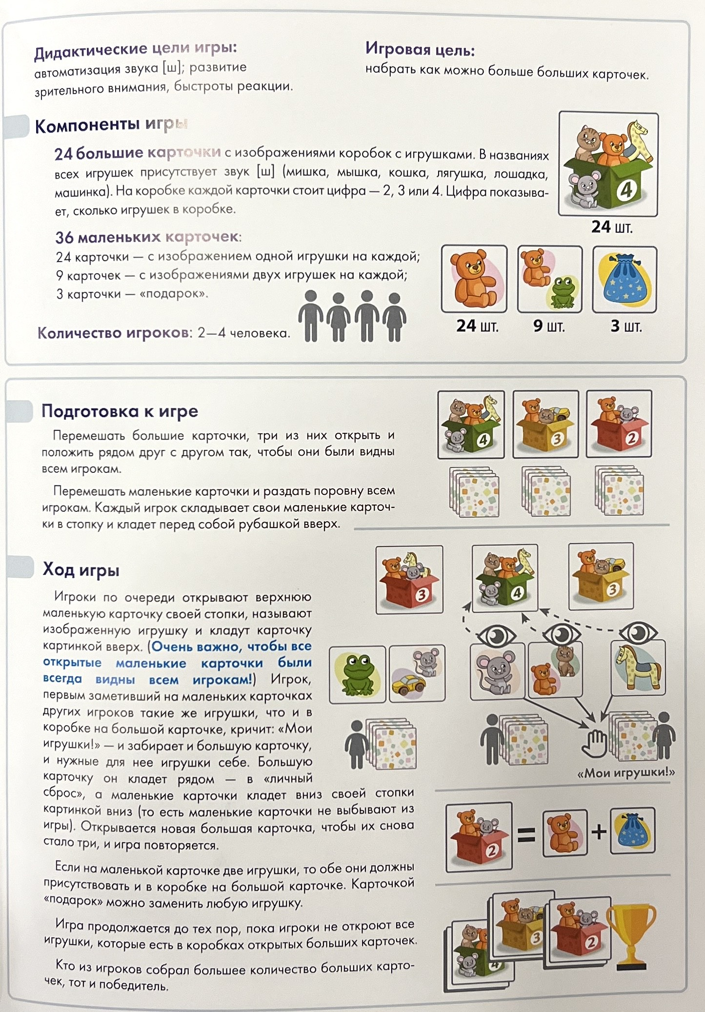 Didaktiskajā spēlē ir iekļautas krāsainas kartītes ar rotaļlietu attēliem, kuru nosaukumos ir skaņa [š]. Spēli var spēlēt 2-4 cilvēki. Spēles didaktiskie mērķi: skaņas [š] automatizēšana; vizuālās uzmanības, ātrās reakcijas laika attīstīšana; prasmes spēlēties ar vienaudžiem izkopšana.