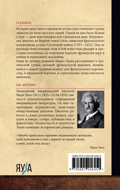 Vēsture zina daudz piemēru, kad valsts pastāvēšana bija atkarīga no vienkāršo cilvēku gribas. Viens no tiem bija Žanna d'Ark, Orleāna jaunava jeb Orleāna jaunava. Nepratīga meitene no nabadzīgas ģimenes kļuva par Francijas patriotisma simbolu Simtgadu kara (1337-1453) laikā. Viņas vadībā slaveni bruņinieki un zemnieku kaujinieki drosmīgi devās kaujās, viņas parādīšanās atgrieza franču ticību uzvarai un pavērsa kara gaitu. Viens no labākajiem Marka Tvena romāniem stāsta par jaunas franču meitenes traģisko likteni, kura parādījās Francijas karalistei visgrūtākajā brīdī un kuru, briesmām pārvarot, nodeva karalis un viņas pavadoņi.