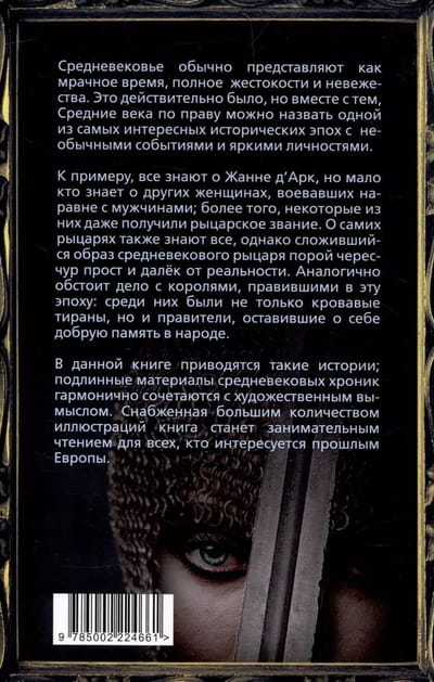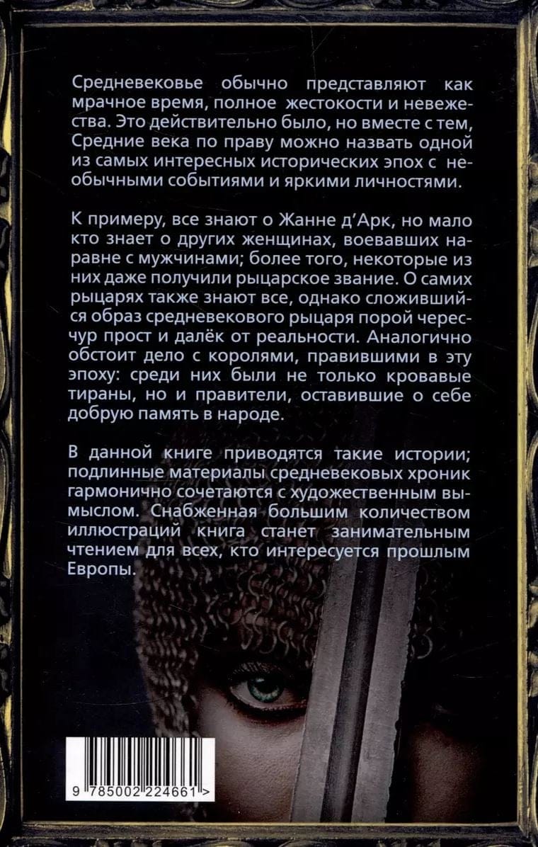 Viduslaiki parasti tiek attēloti kā tumšs laiks, pilns nežēlības un nezināšanas. Tas tā patiešām bija, taču vienlaikus viduslaiki pamatoti dēvējami par vienu no interesantākajiem vēstures laikmetiem ar neparastiem notikumiem un spilgtām personībām. Piemēram, visi zina par Žannu d'Arku, bet tikai retais zina par citām sievietēm, kas cīnījās līdzās vīriešiem, turklāt dažas no viņām pat saņēma bruņinieku titulus. Ikviens zina arī par pašiem bruņiniekiem, taču viduslaiku bruņinieka tēls dažkārt ir pārāk vienkāršs un tālu no realitātes. Tas pats attiecas arī uz karaļiem, kas valdīja šajā laikmetā: viņu vidū bija ne tikai asiņaini tirāni, bet arī valdnieki, kas cilvēkiem atstāja labu piemiņu. Šī grāmata stāsta par tādiem; autentiski materiāli no viduslaiku hronikām ir saskaņoti ar daiļliteratūru. Ar daudzām ilustrācijām šī grāmata būs aizraujoša lasāmviela ikvienam, kas interesējas par Eiropas pagātni.