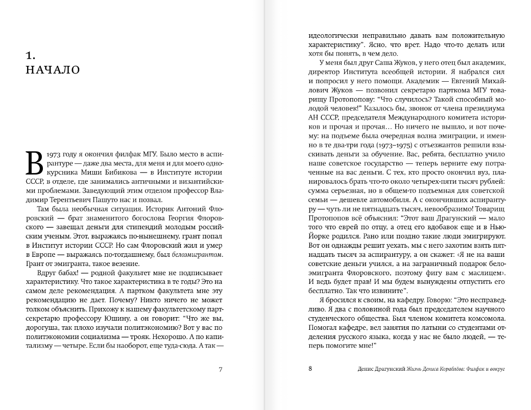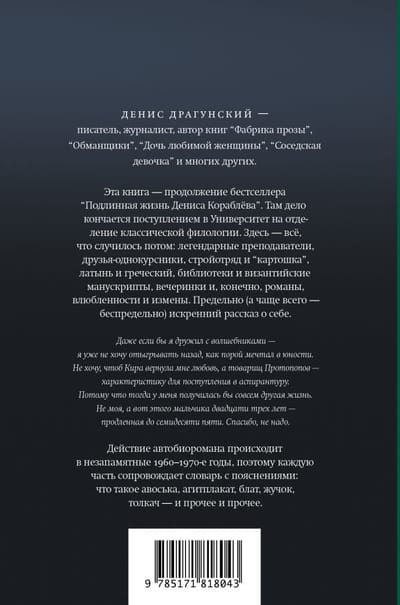 Šī grāmata ir turpinājums bestselleram "Denisa Korabjova īstā dzīve". Tur stāsts beidzas ar viņa uzņemšanu universitātes klasiskās filoloģijas nodaļā. Šeit ir viss, kas notika pēc tam: leģendāri profesori, studiju biedri, celtniecības brigāde un "kartupeļi", latīņu un grieķu valoda, bibliotēkas un bizantiešu manuskripti, ballītes un, protams, romāni, mīlas dēkas un nodevības. Pilnīgi (un bieži vien bezgalīgi) patiess stāsts par sevi.