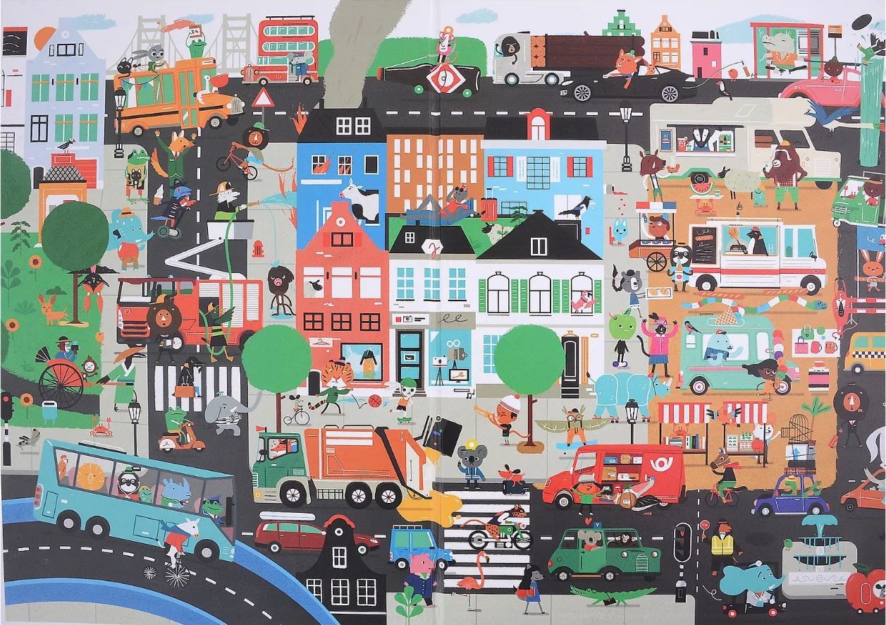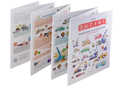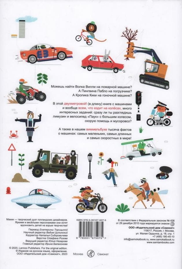 Šajā divmetrīgajā! (garumā) grāmata ar automašīnām un visu, kas brauc uz riteņiem, daudzi interesanti uzdevumi: vai jūs uzreiz atpazīsiet limuzīnu un "Zirnekļa" velosipēdu ar lielu riteni, ātro palīdzību un atkritumu mašīnu?