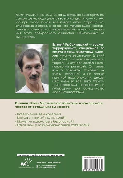 Jevgeņijs Ribaltovskis ir zoologs, terārijists, eksotisko dzīvnieku speciālists, augstākās kategorijas pedagogs. Daudzus gadu desmitus Jevgeņijs ir strādājis ar šiem noslēpumainajiem radījumiem un pētījis visas rāpuļu uzvedības īpatnības. Viņš zina visu par to paradumiem, dzīves apstākļiem, dīvaino un mums ne vienmēr saprotamo fizioloģiju, kas čūskas visos gadsimtos padarīja par tik noslēpumainām, nesaprotamām un vairumam cilvēku biedējošām būtnēm.