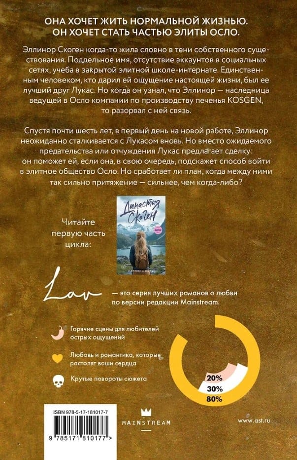 Elinora Skogena savulaik dzīvoja savas eksistences ēnā. Viņai bija izdomāts vārds, nebija sociālo mediju kontu, un viņa mācījās slēgtā, elitārā internātskolā. Vienīgais cilvēks, kas viņai deva sajūtu par īstu dzīvi, bija viņas labākais draugs Lūkass. Taču, kad viņš uzzināja, ka Elinora ir Oslo vadošā cepumu uzņēmuma Kosgen mantiniece, viņš pārtrauca viņas sarunas.