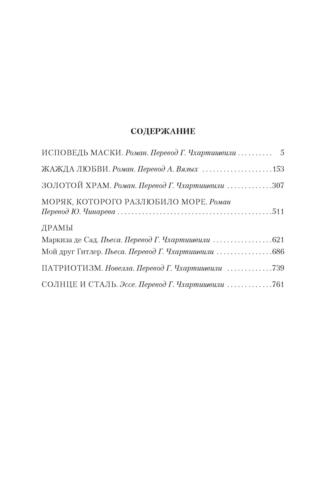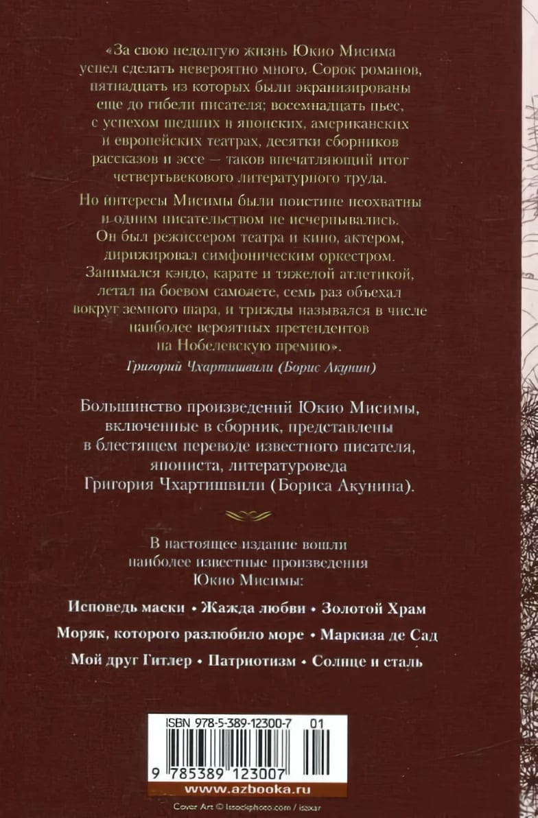 Jukio Mišima ir slavenākais un visplašāk lasītais japāņu rakstnieks pasaulē. Viņš ir pazīstams gan ar saviem darbiem visos iedomājamajos žanros (romāni, lugas, īsie stāsti, esejas), gan ar savu ekstravaganto dzīves un nāves stilu (viņa hara-kiri pēc neveiksmīga apvērsuma mēģinājuma). Šajā izdevumā iekļauti viņa slavenākie romāni: "Maskas atzīšanās", "Ilgas pēc mīlestības", "Zelta templis", "Jūrnieks, kuru jūra pārstāja mīlēt", divas lugas - "Marķīze de Sada" un "Mans draugs Hitlers", eseja "Saule un tērauds" un slavenā novele "Patriotisms", kas, pēc Mišimas teiktā, ir "stāsts par patiesu laimi".
