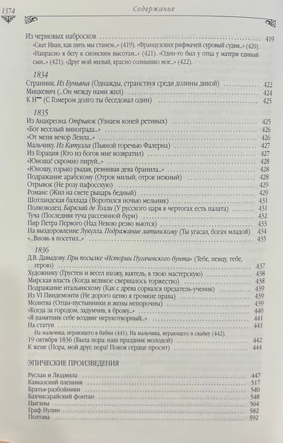 Grezns, stilīgi veidots dāvanu izdevums. Grāmatas elegantais auduma iesējums ir veidots ar reljefu iespiedumu zem vārda "zelts" un trīspusēju zelta malu. Izdevumam pievienota zīda grāmatzīme. Šajā Puškina darbu izdevumā iekļauti visi dižā dzejnieka darbi, visi pilnīgi un neatņemami, ieskaitot nelielus dzejoļus un fragmentus. "Zelta" sējuma materiāla sakārtojumā izdevniecības redaktori vadījās no tā, kas ir pieņemts vairumā Puškina izdevumu: proza, dzeja, un katrā no šīm lielajām sadaļām tika izcelti nozīmīga apjoma darbi: romāni, stāsti, drāmas, un visi pārējie mazākie darbi ir sakārtoti hronoloģiskā secībā pa gadiem.