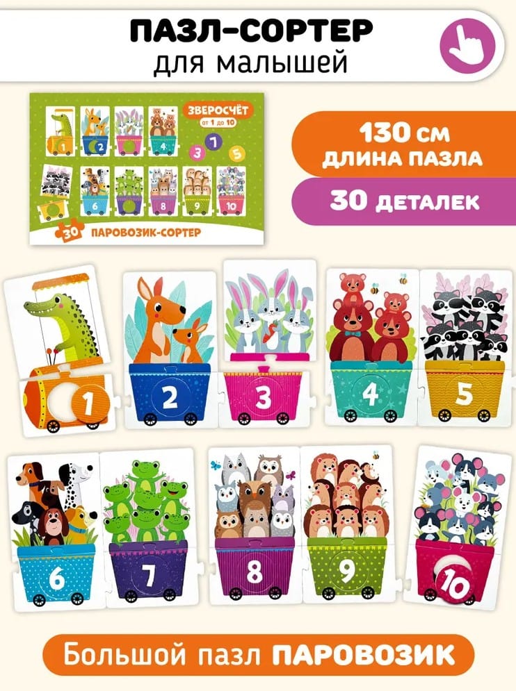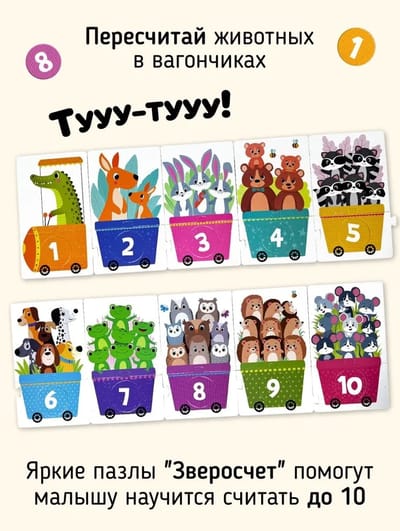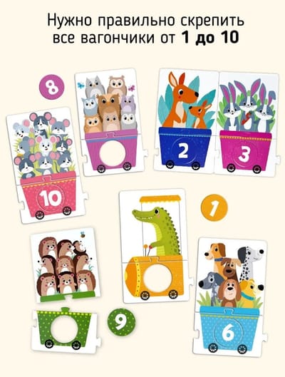 Sagatavojieties aizraujošam piedzīvojumam ar vilcienu un tā dzīvnieku pasažieriem! Pirms došanās ceļā jūsu mazajam būs jāveic svarīgs uzdevums: pareizi piestiprināt visus vagonus no 1 līdz 10. Brauciet ar dzīvniekiem, saskaitiet tos un saskaņojiet vagonu numurus!