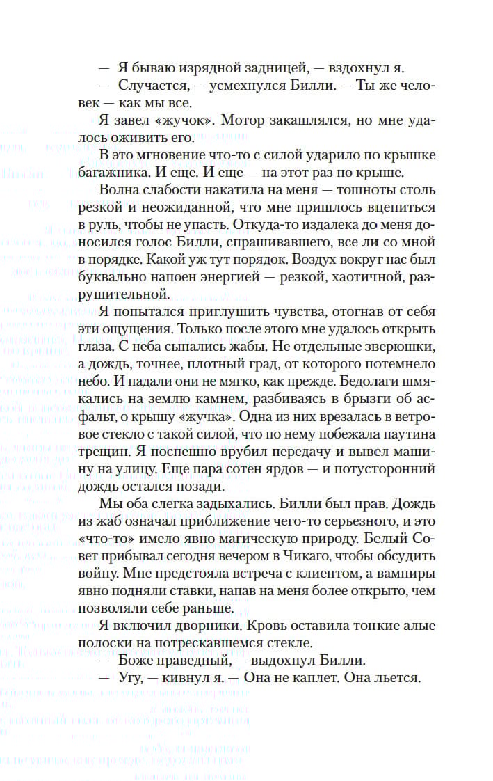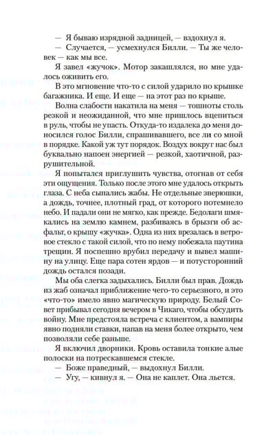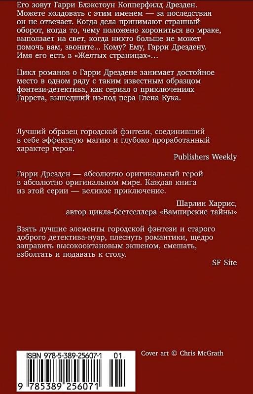 Его зовут Гарри Блэкстоун Копперфилд Дрезден. Можете колдовать с этим именем — за последствия он не отвечает. Когда дела принимают странный оборот, когда то, чему положено хорониться во мраке, выползает на свет, когда никто больше не может помочь вам, звоните... Кому? Ему, Гарри Дрездену. Имя его есть в «Желтых страницах»… Новая череда приключений детектива-волшебника Гарри Дрездена, который расследует всевозможные магические неурядицы в мире альтернативного Чикаго. На этот раз судьба подбросила Гарри дело не из простых: убит Летний Рыцарь, посредник между Летним и Зимним дворами фэйри, и миссия чародея Гарри не только расследовать это дело, но и остановить войну, сотрясающую миры, земной и потусторонний… Цикл романов о Гарри Дрездене занимает достойное место в одном ряду с таким известным образцом фэнтези-детектива, как сериал о приключениях Гаррета, вышедший из-под пера Глена Кука.