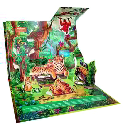 Яркая энциклопедия «Джунгли» в формате книжки-панорамки с невероятными объемными иллюстрациями. 3D развороты создают ощущение дополненной реальности и присутствия в настоящих джунглях. На каждом развороте есть откидной клапан-сюрприз, заглянув под который малыш увидит интересный факт или изображение. Наличие объемных и открывающихся элементов развивает мелкую моторику и пространственное мышление ребенка. Порадуйте своего ребенка увлекательной энциклопедией-панорамкой с яркими, объемными иллюстрациями!