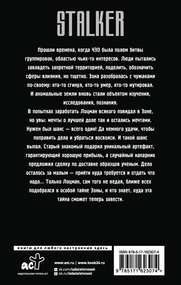 В попытках заработать Лоцман всякого повидал в Зоне, но увы: мечты о лучшей доле так и остались мечтами. Нужен был шанс — всего один! Да немного удачи, чтобы поправить дела и убраться восвояси. И такой шанс выпал. Старый знакомый подарил уникальный артефакт, гарантирующий хорошую прибыль, а случайный напарник предложил сделку по доставке образцов ученым. Дело осталось за малым — прийти куда требуется и отдать что надо... Только Лоцман, сам того не ведая, ближе всех подобрался к особой тайне Зоны, и кто знает, куда эта тайна сможет теперь завести.