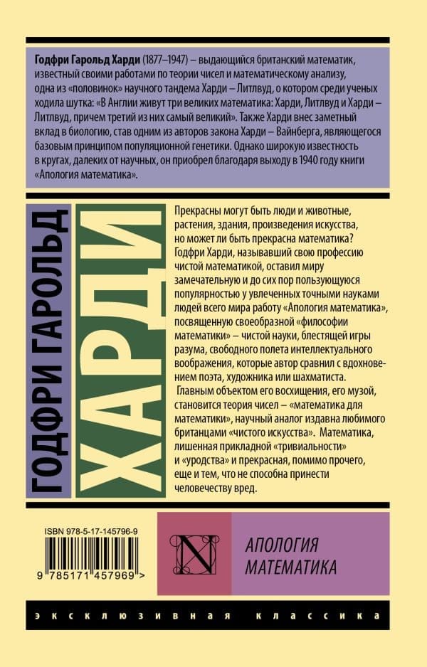 Годфри Харди, называвший свою профессию «чистой математикой», оставил миру замечательную и до сих пор пользующуюся популярностью у увлеченных точными науками людей всего мира работу «Апология математика», посвященную своеобразной «философии математики» — чистой науки, блестящей игры разума, свободного полета интеллектуального воображения, которые автор сравнил с вдохновением поэта, художника или шахматиста.
