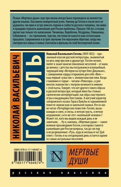 Поэма «Мертвые души» еще при жизни автора была переведена на множество других языков. Она имела невероятный успех. Никому до Гоголя и после него не удавалось так ярко и остро описать пороки и слабости русского человека, так живо и правдиво отразить важнейшие для России проблемы. Прошло 160 лет, и поэма звучит как только что написанная. Чичиковы, Коробочки, Ноздревы, Плюшкины, Собакевичи — их стремления, чувства, поступки не кажутся нам отголосками прошлого. Современное и острое звучание эти персонажи обретают, когда мы смотрим все новые и новые спектакли и фильмы по этой бессмертной поэме.