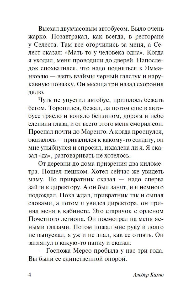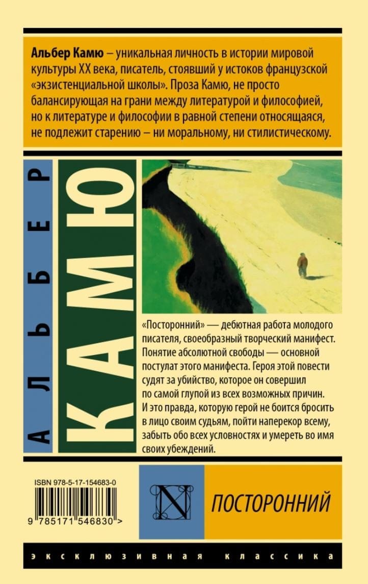 «‎Посторонний»‎ — дебютная работа молодого писателя, своеобразный творческий манифест. Понятие абсолютной свободы — основной постулат этого манифеста. Героя этой повести судят за убийство, которое он совершил по самой глупой из всех возможных причин. И это правда, которую герой не боится бросить в лицо своим судьям, пойти наперекор всему, забыть обо всех условностях и умереть во имя своих убеждений.