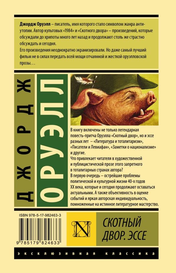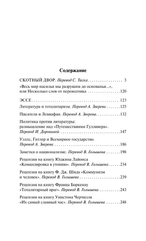 В книгу включена не только легендарная повесть-притча Оруэлла «‎Скотный двор»‎, но и эссе разных лет – «‎Литература и тоталитаризм»‎, «‎Писатели и Левиафан»‎, «‎Заметки о национализме»‎ и другие.