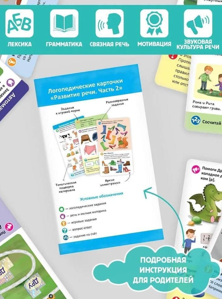 Это умные карточки, которые помогут вашему малышу стать настоящим вундеркиндом с пелёнок. Карточки разбиты на наборы по темам, которые направлены на постановку и автоматизацию звуков, предлагают различные упражнения для артикуляционной гимнастики, способствуют запуску речи. Это логопедическое пособие адресовано логопедам, дефектологам, родителям. Оно может также стать отличным подарком и малышу ваших друзей, и для группы в детском саду.