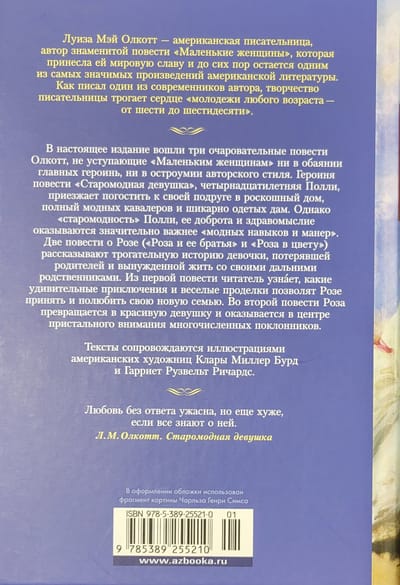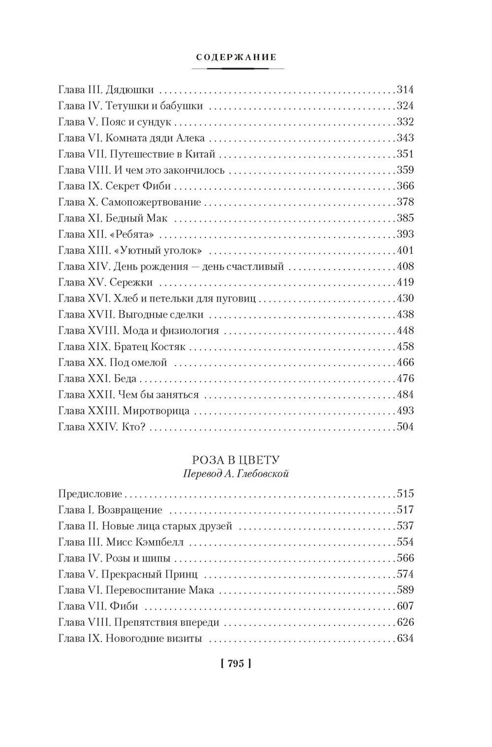 В настоящее издание вошли три очаровательные повести Олкотт, не уступающие «Маленьким женщинам» ни в обаянии главных героинь, ни в остроумии авторского стиля. Героиня повести «Старомодная девушка», четырнадцатилетняя Полли, приезжает погостить к своей подруге в роскошный дом, полный модных кавалеров и шикарно одетых дам. Однако «старомодность» Полли, ее доброта и здравомыслие оказываются значительно важнее «модных навыков и манер». Две повести о Розе («Роза и ее братья» и «Роза в цвету») рассказывают трогательную историю девочки, потерявшей родителей и вынужденной жить со своими дальними родственниками. Из первой части читатель узнаёт, какие удивительные приключения и веселые проделки позволят Розе принять и полюбить свою новую семью. Во второй части Роза превращается в красивую девушку и оказывается в центре пристального внимания многочисленных поклонников.
