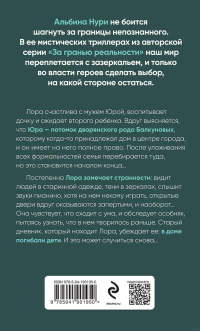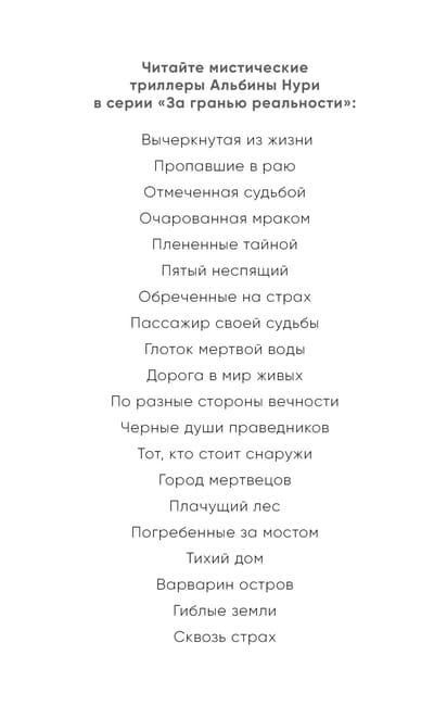 Романы Альбины Нури — целый мир, в котором реальность переплетается с мистикой и потусторонним миром, где действуют законы, отличные от законов разума. Герои сталкиваются с необъяснимыми явлениями, идущими вразрез с обыденной картиной мира, и им предстоит через многое пройти, чтобы вернуть свою жизнь в привычное русло. Романы Альбины Нури нравятся как читателям, так и критикам.