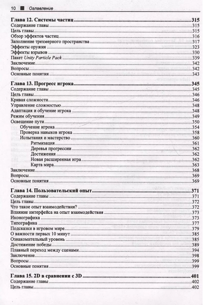 Базовая книга об игровом движке Unity для разработки 2D- и 3D-игр на языке C# с применением специальных сценариев и библиотек. Рассмотрены базовые вопросы программирования игр: прототипирование, создание визуальных эффектов, разработка физики, оформление интерфейса, повышение производительности и отзывчивости программы. Уделено внимание специфике игрового движка Unity, подготовке игр к релизу, работе со скриптами на C#, юзабилити, развитию и усовершенствованию игр-прототипов.