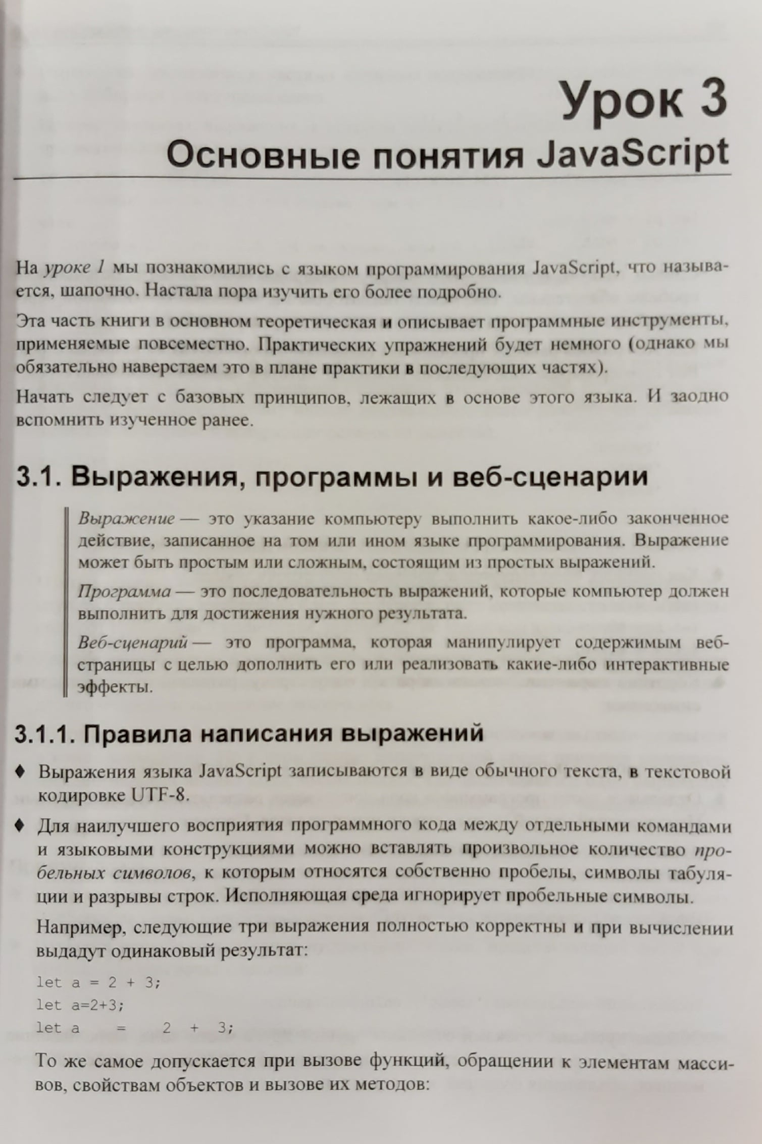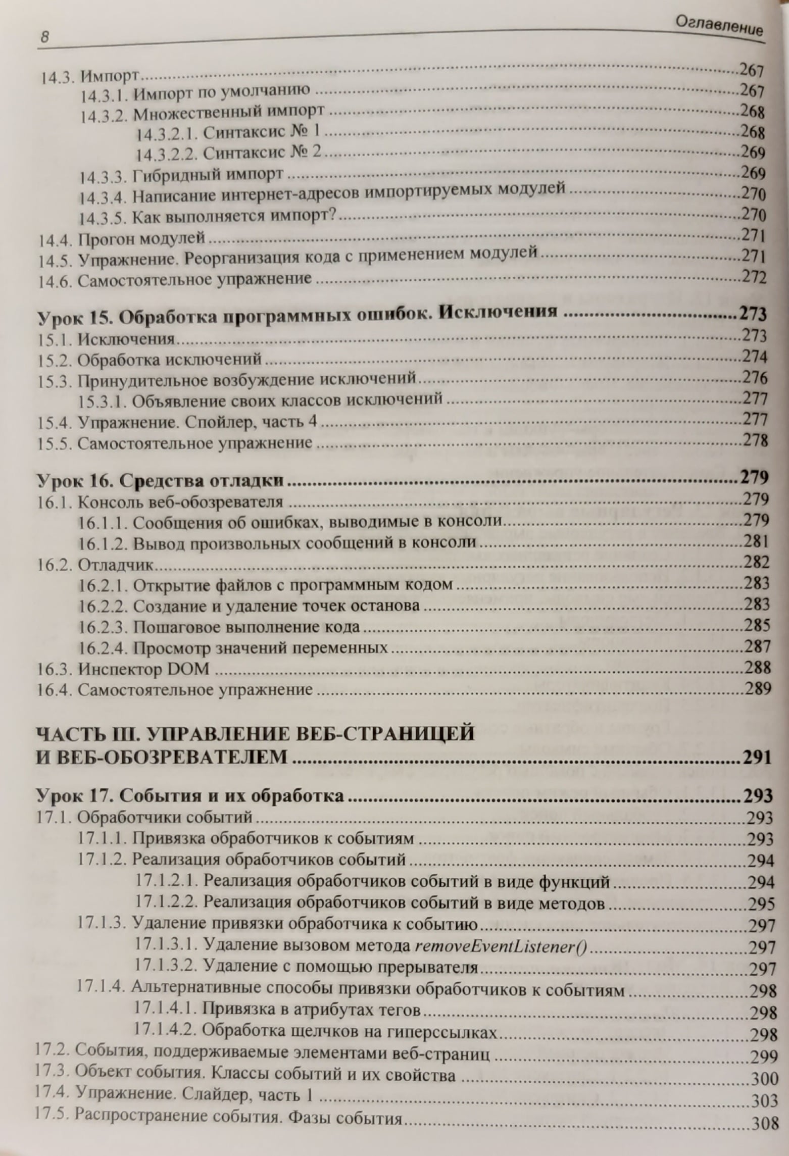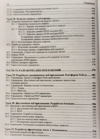 В книге 32 иллюстрированных урока, 40 практических упражнений на тему программирования веб-сценариев и более 20 заданий для самостоятельной работы. Изложены основы JavaScript: типы данных, переменные, управляющие конструкции, функции, массивы, объекты, классы, регулярные выражения, модули, средства для обработки исключений и отладки. Раскрыты события и их обработка, генерирование содержимого страниц, работа с графикой и мультимедиа, веб-формами и элементами управления, взаимодействие с веб-обозревателем, детекторы видимости и изменения размеров. Рассмотрены таймеры, фоновые потоки, использование промисов и асинхронных функций, работа с файлами, программная графика и загрузка данных с веб-сервера. Рассказано о программировании фронтенд- и бэкенд-приложений в среде Node.js, а также об обработке межхостовых запросов. Электронный архив на сайте издательства содержит коды всех примеров и результаты выполнения упражнений.