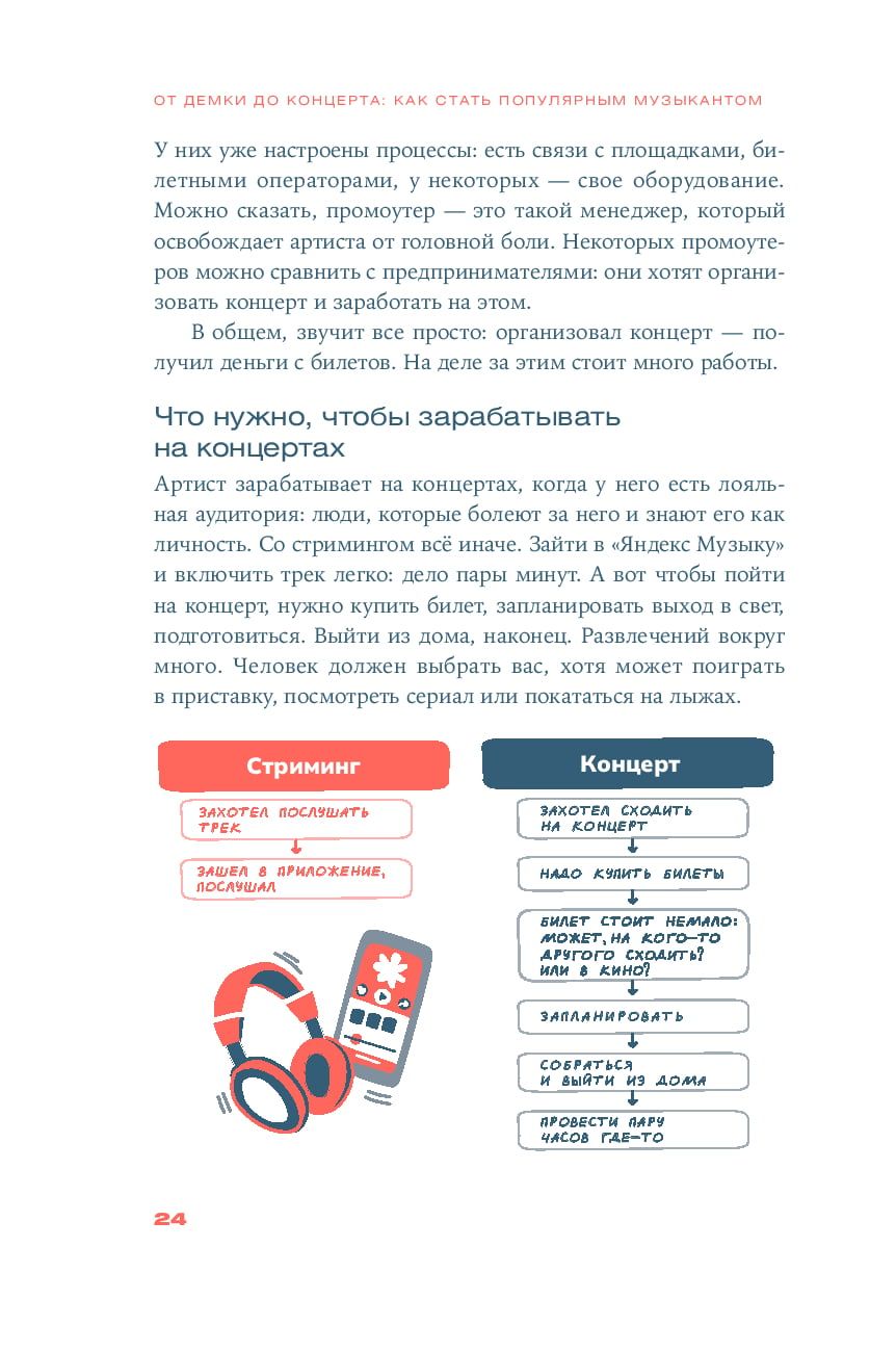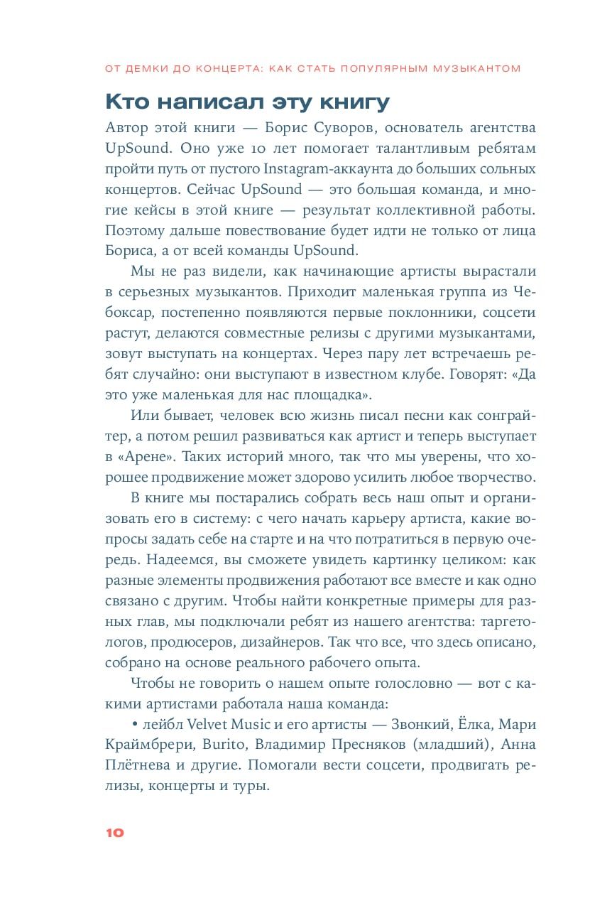 Как записать хит, который взорвет чарты и надолго останется в миллионах плейлистов и роликов в TikTok? Как создать запоминающийся сценический образ и общаться с поклонниками? А как снять вирусный клип, организовать успешный концерт и как вообще работает российская музыкальная индустрия? В книге «От демки до концерта» Борис Суворов, основатель музыкального агентства UpSound, отвечает на самые актуальные вопросы всех, кто хочет зарабатывать на своей музыке. В ней вы найдете профессиональные советы по созданию музыкального контента, продвижению и продюсированию, а также прочитаете о юридических тонкостях и спорных моментах, самых распространенных ошибках новичков и опасностях, подстерегающих на пути к славе. И, самое главное, научитесь у профессионала управлять музыкальной карьерой, не полагаясь на мимолетный хайп и переменчивую удачу.