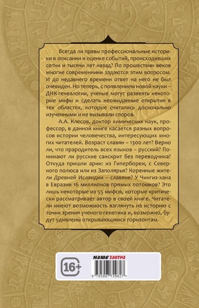 А. А. Клесов, доктор химических наук, профессор, в данной книге касается разных вопросов истории человечества, интересующих многих читателей. Возраст славян – 1300 лет? Верно ли, что прародитель всех языков– русский? Понимают ли русские санскрит без переводчика? Откуда пришли арии: из Гипербореи, с Северного полюса или из Заполярья? Коренные жители Древней Исландии – славяне? У Чингиз-хана в Евразии 16 миллионов прямых потомков? Это лишь некоторые из 55 мифов, которые критически рассматривает автор в своей книге. Читатели имеют возможность взглянуть на историю с точки зрения ученого-генетика и, возможно, будут удивлены открывающимся горизонтам.