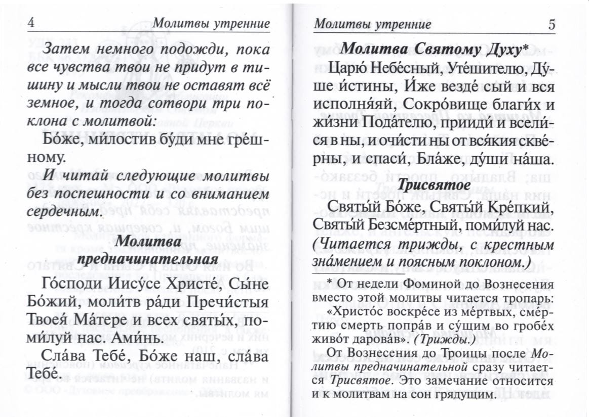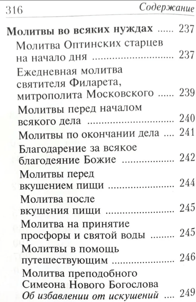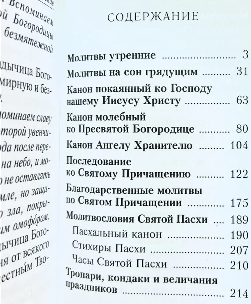 Молитвослов карманного формата, напечатанный гражданским шрифтом, кроме традиционных молитвословий — утреннего и вечернего правила, последования ко Святому Причащению и благодарственных молитв после него — содержит молитвы о болящих, молитвы во всяких нуждах, о детях и ближних, пасхальные песнопения, а также Богородичное правило. Каноны ко Причащению раздельные. Для удобства книга снабжена ленточкой-закладкой.