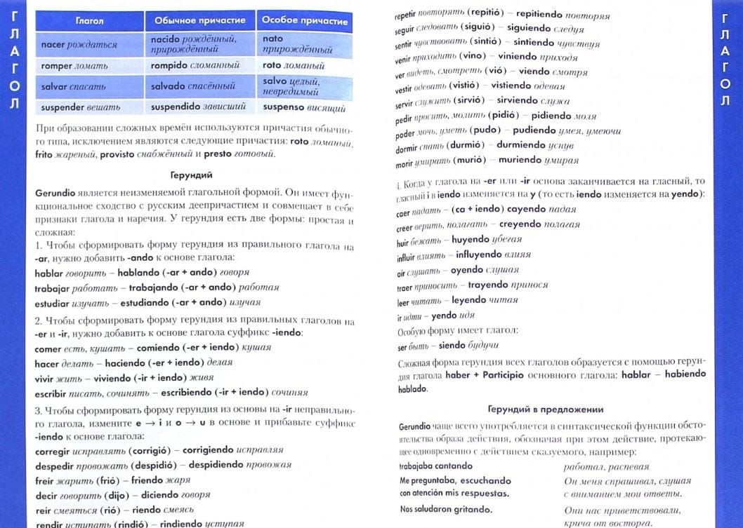 Данный справочник представляет собой многофункциональное пособие, содержащее основные систематизированные сведения о грамматике испанского языка. Издание предназначено для изучающих язык как самостоятельно, так и с преподавателем. В пособии описывается морфология современного испанского языка, образование форм слова и их функционирование в живой письменной и устной речи носителей. Все формы слов и иллюстративные примеры снабжены русскими переводами и ударениями, которые даются в соответствии с современными языковыми нормами.