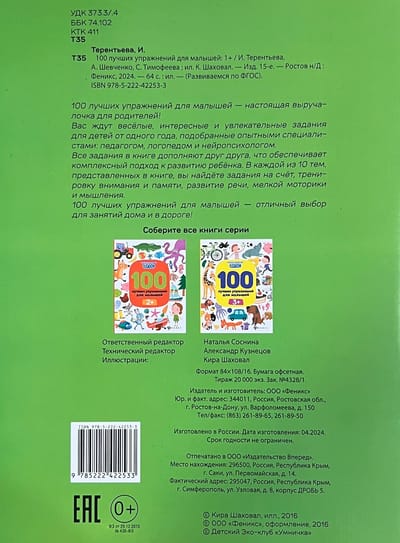 100 лучших упражнений для малышей - настоящая выручалочка для родителей. Вас ждут веселые, интересные и увлекательные задания для детей от одного года, подобранные опытными специалистами: педагогом, логопедом и нейропсихологом. Все задания в книге дополняют друг друга, что обеспечивает комплексный подход к развитию ребёнка. В каждой из 10 тем, представленных в книге, вы найдёте задания на счет, тренировку внимания и памяти, развитие речи, мелкой моторики и мышления. 100 лучших упражнений для малышей - отличный выбор для занятий дома и в дороге.