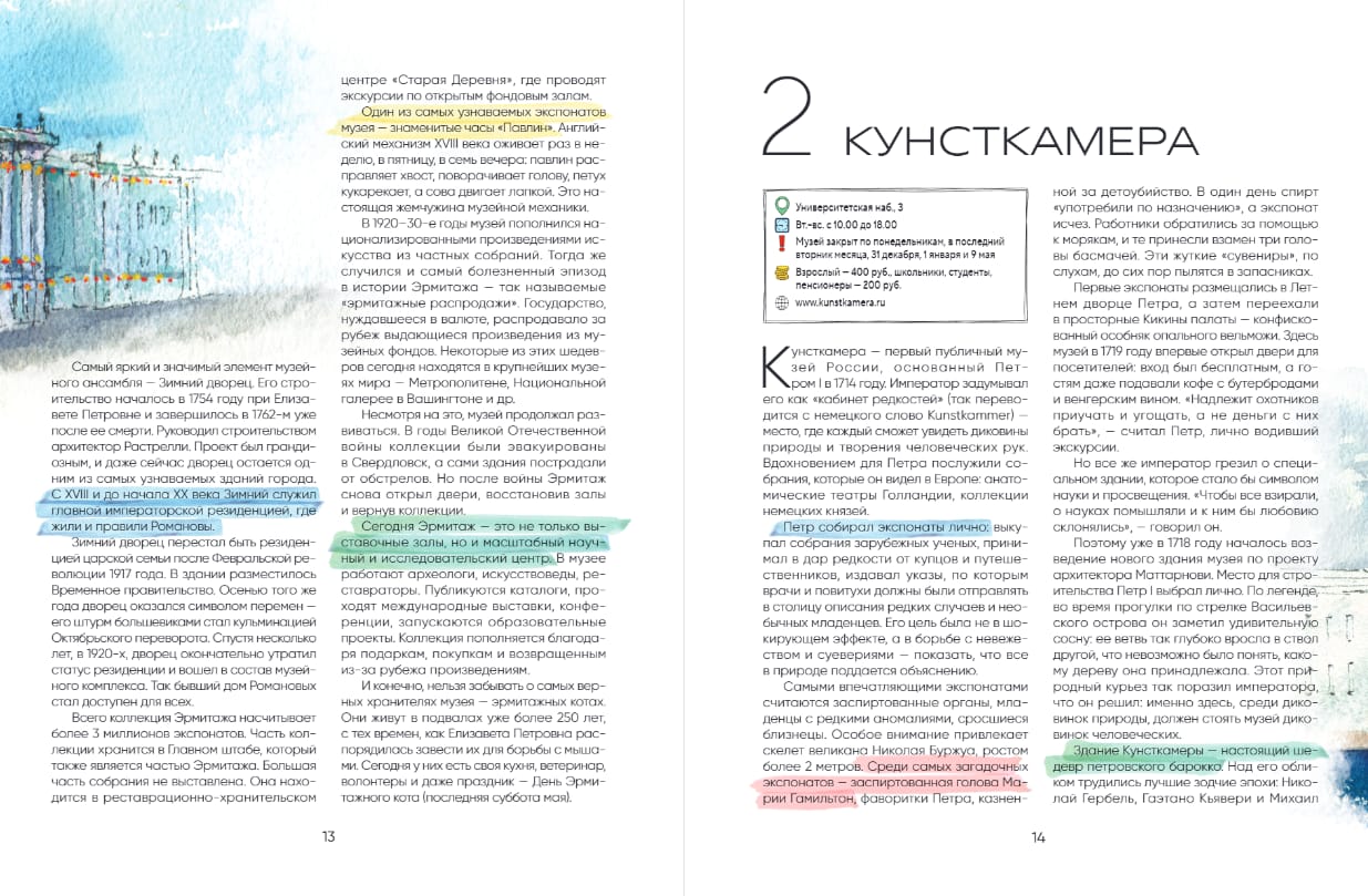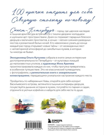 Экскурсовод Ольга Кутузова собрала в книге самые интересные достопримечательности Санкт- Петербурга — от знаковых мест до скрытых уголков, а художница Инна Арапова превратила их в серию акварельных travel-скетчей, наполненных светом, воздухом и эмоциями.