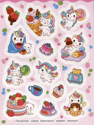 Коничива! (Добрый день!) Кавайные единорожки не дадут вам скучать! Играть, танцевать, путешествовать – каждый день можно делать что-то интересное. Уникальные яркие иллюстрации поднимут настроение даже в самый хмурый день. Наклейками можно украсить ежедневник, тетради, скетчбук, телефон и многое другое!